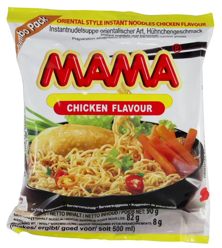 10 x 90g = 900gMAMA Instant Nudelsuppe mit Hühnchengeschmack – Jumbo PackInstant Noodles Chicken Flavour – JumboOrientalischer ArtZubereitung:Die Nudel sowie den Inhalt der übrigen Beutel in einen Kochtopf mit 500ml kochendem Wasser geben.Die Zutaten 3 Minuten zugedeckt ziehen lassen.Gelegentlich umrühren. Fertig! Zutaten:Nudeln (82g): WEIZENmehl (Amerika, Kanada, Australien) 70%, modifizierte Tapiokastärke, Palmöl, Salz, Zucker, Säureregulator: E451, E500, E501, Verdickungsmittel: E466, SOJAsauce. Suppenpulver (4,7g): Salz, Zucker, Geschmacksverstärker: E621; E635, Gewürze, Farbstoff: E105a, getrocknete Frühlingszwiebeln, Säuerungsmittel: E330, Aroma.Gewürzöl (3,0g): Palmöl, Knoblauch.Chilipulver (0,3g). Allergene: Weizen, Soja. Allergiker-Information: Dieses Produkt kann Spuren von Krebstieren, Eiern, Fisch, Milch, Sellerie und Sesam enthalten. Inhalt: je 90g x 10 = 900g Ergibt je 90g – Packung ca. 500 ml Suppe Mindestens Haltbar bis: 24. 01. 2026 Herkunft: Thailand Importeur: ASIA EXPRESS FOOD, Kilbystraat 1, 8263 CJ Kampen (NL) Versandgewicht: 1.500g Durchschnittliche Nährwertangaben pro 100g Average Nutritional Values per 100g Brennwert / Energy 1859 kJ / 443 kcal Fett / Fat 19g davon gesättigte Fettsäuren / of which saturates 10g Kohlenhydrate / Carbohydrates 60g davon Zucker / of which sugar 3,9g Eiweiß / Protein 7,9g Salz / Salt 5,0g