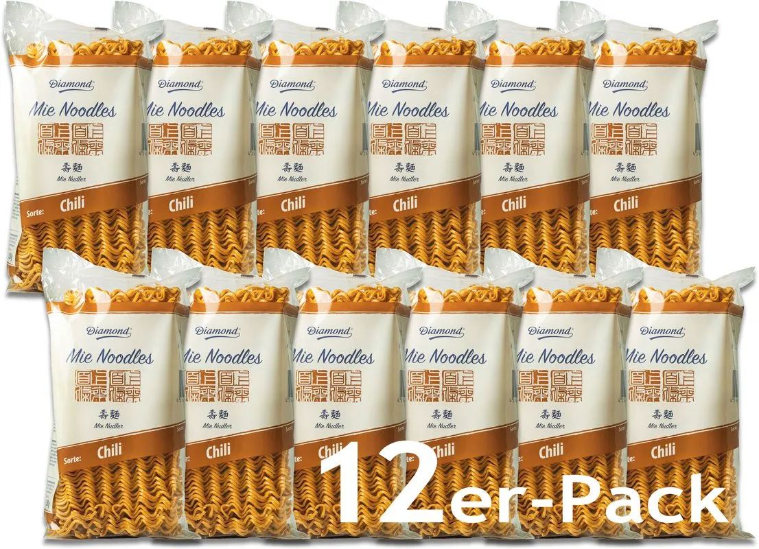 [ 12x 250g ] DIAMOND Mie Noodles mit Chilipulver / Chili Mie Nudeln ohne Ei / Wok Nudeln