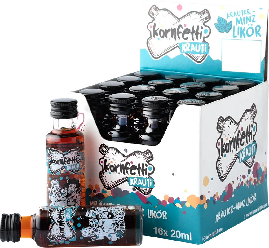 More information about 16x Kornfetti Krauti Minis Our Kornfetti Krauti liqueur is a unique blend of 100% natural ingredients. It combines the mild taste of our Kornfetti grain with 27 sweet and noble herbs and the fresh note of mint. This liqueur is perfect for those who like it colorful and loud!The design by the well-known street artist Bobbie Serrano from Hamburg makes the liqueur a real eye-catcher at any party.The Kornfetti Krauti is served ice cold from the freezer compartment. This makes it particularly mild and light. In contrast to other herbal liqueurs, Kornfetti Krauti is much lighter and more pleasant at 25% vol. With Kornfetti Krauti, every party becomes a colorful and noisy experience – perfect for any weekend or a good time with friends.Drinking recommendationAs a shot, we recommend a drinking temperature of -8 C°, preferably ice cold. This brings out the full flavor of the liqueur and ensures a pleasant drinking experience.Kornfetti Krauti is perfect for any party, bar or club visit. This liqueur is a real treat for anyone who likes it spicy, sweet and fresh.Origin100% natural ingredients. Wheat, 100% from German cultivation, refined with velvety soft water from the Nordheide. Glass and raw distillate are sourced regionally. Designed in Hamburg.ProductionWe only use water from the Nordheide region to produce our Kornfetti Krauti liqueur. Our regionally produced Kornfetti Korn serves as the basis. We attach great importance to natural ingredients and therefore only use 100% natural ingredients. After careful production, the liqueur is bottled in the region. Enjoy the unique taste of Kornfetti Krauti liqueur and let us convince you of the quality of our regional products.TastingAppearance: brown, naturally cloudyAroma: noble, sweet, herbs and mintAroma: full-bodied with herbs and a fresh hint of mint