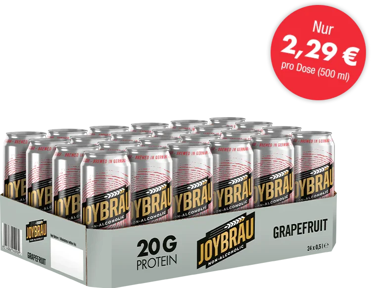 More information about 24x JoyBräu Grapefruit Juicy grapefruit and valuable protein meet non-alcoholic beer20g of valuable protein100% natural & veganBeer brewed according to the German purity lawJoyBräu is back! And our bestseller in grapefruit flavor is better than ever. You can expect a whopping 20g of protein per can with a refreshing grapefruit flavor. The world’s first beer for your performance. Naturally alcohol-free and brewed to the highest quality standards. Because good wasn’t good enough for us!Try it now and enjoy.
