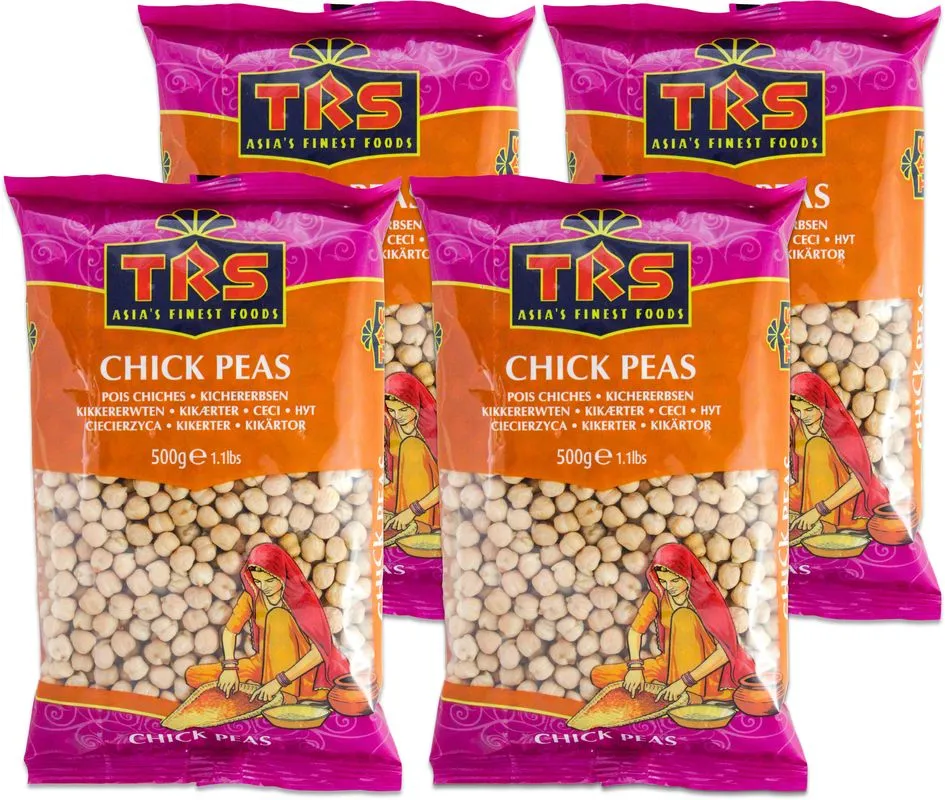 4x 500g = 2.000gTRS KichererbsenChick Peas Zutaten: Kichererbsen. Inhalt: 500g x 4 = 2.000g Mindestens Haltbar bis: 12. 02. 2026 USAGE / VERWENDUNG:All pulses and beans require soaking before cooking. Times vary according to recipes and you should consult your cookery book. Pulses and beans are agricultural produce and although this product has been machine cleaned, it should be examined carefully and washed thoroughly before use. Please cook before consumption.Hülsenfrüchte und Bohnen müssen vor dem Kochen in Wasser eingeweicht werden. Die Dauer hängt vom Rezept ab. Achten Sie auf die Hinweise in Ihrem Kochbuch. Hülsenfrüchte sind landwirtschaftliche Erzeugnisse. Dieses Produkt wurde zwar im maschinellen Verfahren gereinigt, sollte aber vor dem Gebrauch dennoch sorgfältig geprüft und gründlich gewaschen werden. Vor dem Verzehr bitte kochen. STORAGE / LAGERUNG:To retain freshness and flavour store in an airtight container, in a cool dry place.Zum Erhalt von Frische und Geschmack in einem luftdichten Behälter kühl und trocken lagern. Herkunft: Verpackt in Kanada aus EU- und Nicht-EU-Produkten Hersteller:TRS Wholesale Co. Ltd,Southall Middlesex, UB2 4AXEngland. UB2 4AX Lebensmittelunternehmen: Vibrant Foods BV, Hofplein 20, 3032 AC, Rotterdam, The Netherlands. Versandgewicht: 2.500g Durchschnittliche Nährwertangaben pro 100g Average Nutritional Values per 100g Brennwert / Energy 1718kJ / 411kcal Fett / Fat 2,1g davon gesättigte Fettsäuren / of which saturates 0,2g Kohlenhydrate / Carbohydrates 16,8g davon Zucker / of which sugar 1,0g Ballaststoffe / Fibre 4,3g Eiweiße / Protein 8,4g Salz / Salt Spuren