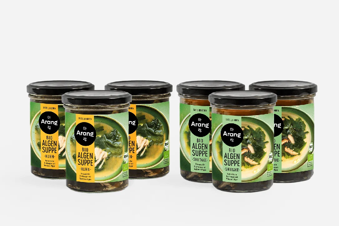 Alle Informationen zu Algensuppe Kombi 6er Set Dieses Kombi-Paket enthält jeweils drei Gläser der Sorte Seetangsuppe Huhn und drei Gläser der Sorte Seetangsuppe Shiitake. Du hast die Ernährung von Algen in deinen Speiseplan aufgenommen und möchtest dich zu Hause gesund, ausgewogen und abwechslungsreich ernähren? Dann ist dieses Kombi-Paket genau das Richtige, um jederzeit schnell und einfach dir eine Schüssel Seetangsuppe zuzubereiten.Das ist im Paket enthalten3x Bio-Algensuppe Huhn- 380 mlDie koreanische Seetangsuppe, auch Miyeokguk genannt, ist eine traditionelle, koreanische Suppe auf Basis von Algen. Als Superfood ist sie aufgrund ihrer vielen wichtigen Nährstoffe bei Alt und Jung äußerst beliebt. Wakame-Algen gelten als reich an Proteinen und Vitamin A, C, E, B6 und B12 – ideal auch für eine vegane Ernährungsweise. In Korea kommt der Seetangsuppe eine besondere Bedeutung zu. Sie wird als traditionelle Geburtstagssuppe gereicht, um damit an die Zeit der Geburt zu erinnern.Zutaten: Geflügelfond (Trinkwasser, Geflügelkarkassen*, Porree*, Knoblauch*, Pfefferkörner schwarz*, Knoblauch*, Meersalz, Pfeffer weiß*), Hähnchenbrust gegart* 5,3%, Wakame-Algen getrocknet* 2,4%, Sojasauce* (Sojabohnen*, Trinkwasser, Weizen*, Salz) Rapsöl *aus kontrolliert biologischer LandwirtschaftNährwerte pro 100ml: Brennwert: 83 kJ/20 kcal | Fett: 0,5 g | davon gesättigte Fettsäuren: 0,2 g | Kohlenhydrate: 1,1 g | davon Zucker: 0 g | Eiweiß: 2,6 g | Salz: 0,76 g | Jod: 118 μg3x Bio-Algensuppe Shiitake – 380 mlDie traditionelle Suppe in der fleischlosen Variante – stattdessen mit Shiitake-Pilzen.Zutaten: Gemüsefond (Trinkwasser, Karotten*, Zwiebeln*, Porree*, Ingwer*, Rapsöl*, Meersalz), Wakame-Algen getrocknet* 1,8%, Shiitakepilze getrocknet* 0,7%, Sojasauce* (Sojabohnen*, Trinkwasser, Weizen*, Salz), Knoblauch*, Agavendicksaft*, Rapsöl*, Pfeffer weiß* *aus kontrolliert biologischer LandwirtschaftNährwerte je 100ml: Brennwert: 73 kJ/17 kcal | Fett: 0,36 g | davon gesättigte Fettsäuren: 0,05 g | Kohlenhydrate: 0,4 g | davon Zucker: 0 g | Eiweiß: 2,8 g | Salz: 0,79 g | Jod: 118 μg