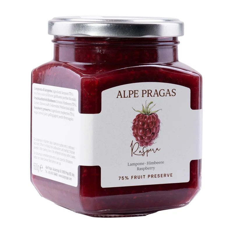 Alpe Pragas | Himbeere Fruchtaufstrich 75% im großen Glas Alpe Pragas Himbeere Fruchtaufstrich als Geschenk | Die von Alpe Pragas verwendete Sorte Willamette ist eine wundervoll dukelrote Himbeere, die einen lieblichen Duft verströmt. Die Sommerhimbeere hat ein intensives Aroma und das spiegelt sich in diesem Alpe Pragas Fruchtaufstrich deutlich wider. Nur mit etwas Zucker und Zitronensaft eingekocht, schmeckt sie toll auf warmen Crepes oder zu Quark oder Joghurt.Im Pragser Tal baut die Familie Gruber seit 1994 Beeren auf ca. 1250 m Berghöhe an. In diesem alpinen Bergklima reifen die Früchte länger und entwickeln somit ein besonders intensives Aroma. Auf einen möglichst naturnahen Anbau der Früchte wird viel Wert gelegt: Die Setzlinge werden von Hand gepflanzt, die Felder bis zur Ernte mehrmals gejätet und mit Fluss- und Quellwasser der Dolomiten bewässert.Dieser köstliche Brotaufstrich Himbeere | Raspera im großen 600g Geschenk Glas hat einen Fruchtanteil von 75% und ist nur mit natürlichem Apfelpektin geliert. Eine besondere Geschenkidee für Feinschmecker. Alpe Pragas | der Luxus-Moment am Morgen als Brotaufstrich, im Müsli, zum Pancake oder Crêpe hocharomatische Früchte hoher Fruchtanteil 75% wenig Zucker ohne künstliche Zusatzstoffe ohne Konservierungsstoffe ohne Farbstoffe ohne Aromen glutenfrei vegan Feinstes aus Früchten | Qualität aus den Dolomiten Alpe Pragas ist eine Genussmanufaktur die Feinstes aus Früchten im Herzen der Dolomiten herstellt. Seit 2002 sind die Brotaufstriche von Alpe Pragas ein fester Bestandteil in unserem Sortiment und von Anfang an sind wir von der besonderen Qualität, dem intensiven Fruchtgeschmack und der einmaligen Konsistenz von Stefan Grubers Fruchtaufstrichen, Marmeladen und Konfitüren in Bio-Qualität begeistert. Was in der Alpe Pragas Genussmanufaktur produziert wird, bringt jeden Gourmet zum Lächeln.Die Früchte werden reif von Hand geerntet, entkernt, geputzt und geschnitten, ohne Zusatz- oder Konservierungsstoffe schonend eingekocht. Vitamine und natürliche Farbe der Früchte, aber vor allem wunderbar intensiver Fruchtgeschmack bleiben so bewahrt. Zum fruchtigen Sortiment gehören Marmelade, Fruchtaufstriche mit hohem Fruchtanteil, Konfitüre in Bio-Qualität, Sirupe, Wein Gelee, Mostarde und Chutney als perfekter Begleiter zu Käse, Fleisch oder Fischgerichten. Gutes aus Südtirol für Genießer: Frisch, fruchtig, authentisch! Einfach köstlich. Alpe Pragas | Ziele für die Zukunft Stefan Grubers nächste große Ziel ist die CO2-neutrale Produktion bis zum Jahr 2027. Dafür baute er 2010 ein hochmodernes Produktionsgebäude sowie einen alpin-designten Verkaufs- und Verkostungsraum, sowie einen neuen Bürotrakt. Die Verarbeitung der Früchte ist ein innovativer Prozess, trotzdem wird so viel es geht in Handarbeit erledigt. Durch die Optimierung der Produktionsprozesse können Ressourcen geschont und Energie eingespart werden, zu dem wurde der Abfall reduziert. Der Familienvater empfindet Verantwortung gegenüber der nächsten Generation schonend mit den Ressourcen Wasser, Energie, Luft und Boden umzugehen. Stefan Gruber liebt die Region in der er aufgewachsen ist und heute mit seiner Familie lebt. „Wir wollen grün produzieren und ECO-Manufactory werden“, erzählt er uns.