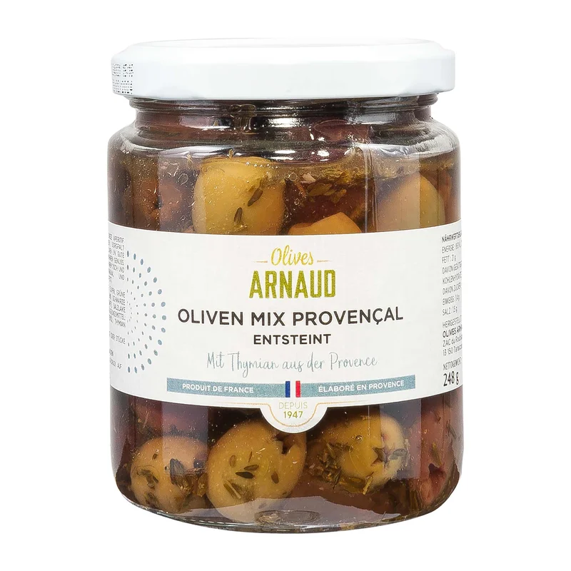 Arnaud | Oliven Mix | mit Thymian der Provence Arnaud bunte entsteinte Oliven Mix mit Thymian aus der Provence führen wir nun im praktischen kleinen Glas für Zuhause. Diese Aperitif Oliven sind mit größter Sorgfalt verarbeitet und werden nur mit ausgesuchten Oliven produziert. Die Arnaud Oliven sind seit 15 Jahren in unserer Frischetheke der absolute Oliven-Liebling unserer Kunden. Die schwarzen Oliven sind, und das ist bei entsteinten Oliven sehr selten, nicht gefärbt! Aperitif perfekt! Der Oliven Mix von Arnaud Ein beinhaltet fünf aromatischsten Olivensorten: grüne Oliven, Picholine Oliven, schwarze Oliven und lila Tailladées und kleine Coquillos-Oliven. Diese werden mit Thymian mariniert in einer Salzlake mit Rotweinessig und Sonnenblumenöl eingelegt. Arnaud | Oliven aus der Provence Das Familienunternehmen Arnaud widmet sich seit 1947 gänzlich der Verarbeitung und Veredlung bester, heimischer Oliven. Die Heimat der Familie Arnaud ist Fortvielle, eines der schönsten Dörfer im Herzen der Provence. Der moderne Betrieb liegt zwischen Arles und Avignon. Direkt nach der Ernte zwischen September und Januar werden Oliven, wie die grünen Picholin Oliven aus dem Vallée des Baux, zu Oliven im Glas verarbeitet. Dabei werden die Oliven zunächst entsteint, die Grünen mit Essig, Kräutern der Provence und Olivenöl eingelegt, die schwarzen, zunächst getrocknet und dann in Gläser gefüllt und ebenfalls mit Kräutern aus der Provence eingelegt. Während der restlichen Zeit zwischen Februar und Juli werden aus Oliven Pastinaden und Cremes hergestellt und grobes Meersalz aus der Camargue mit Kräutern veredelt. Nettogewicht: 248gAbtropfgewicht 130g