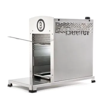 Der Beefer ist komplett aus Edelstahl gefertigt und mit einer Elektro-Zündung sowie einem Ventil-Schutzblech ausgestattet. Anstelle der klassischen Höhenverstellung per Drehknopf verfügt der neue Profi-Beefer über ein Millimeter genaues Einschubraster, das den Rost mit einer einzigen Handbewegung präzise in der gewünschten Höhe aufnimmt. Mit nur einem Handgriff sind die beiden Halterungen für den Rost in Sekundenschnelle ohne Werkzeug herausnehmbar. So lässt sich der komplette Innenraum extrem einfach reinigen. Gewerbezulassung für Verwendung im Freien. Ausstattung: Schlauchbruchsicherung und Gewerbedruckregler (beides gesetzlich vorgeschrieben) sowie 1,5 Meter Schlauch, zwei Roste, zwei Gastronormschalen, Beefer-Griff Temperatur > 800 Grad Celsius 1 Brenner mit 3,5 kW , Maße: H 400, B 240, T 560 mm, Gewicht 16 kg, Gasart Propan, Zündung elektrisch. Das Produkt kann nur innerhalb der BRD und nach Österreich verkauft werden