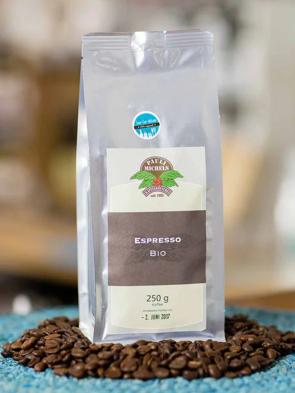 Cuvée aus fünf Rohkaffeesorten Regelmässig vom Feinschmecker prämiert ist die Kaffeerösterei PAULI MICHELS eine modern organisierte Kaffeerösterei, die sich dennoch den traditionellen handwerklichen Produktions-Methoden verpflichtet. Im BIO Espresso sind fünf Rohkaffeesorten vertreten, alle aus zertifiziert ökologischem Anbau. Die Kaffeebohnen werden schonend geröstet nach italienischem Trommelröst-Verfahren. Die BIO Espresso-Mischung (80% Arabica, 20% Robusta) ist kräftig-würzig im Geschmack mit leichter Säure und vollem Körper. Am besten werden sie in der Espressomaschine, Caffetiera oder im Vollautomat mit einer Durchlaufzeit zwischen 18 und 20 Sekundenzubereitet.Langjährige Erfahrung, Tradition und moderne Techniken werden „beim Pauli“ zur Kaffeekunst verbunden. Qualitäsbewusste Kaffeegeniesser und -kenner schätzen das ausgewählte Spezialitäten-Angebot! Pauli setzt hohe Qualitätsansprüche an die Kaffeeauswahl und Röstung sowie an Reinheit und Geschmack des Kaffees. Auf die Unterstützung von sozialen Projekten und die Förderung von Kleinbauern-Kooperativen wird großen Wert gelegt.