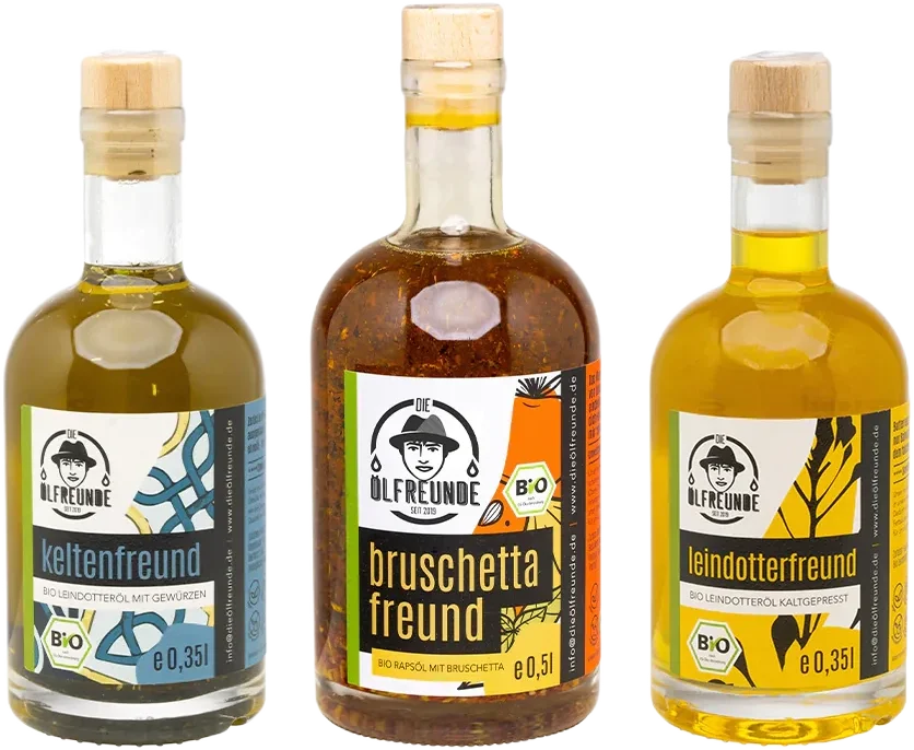 Alle Informationen zu Bio Trio Unser „Bio“-Trio kommt in 3 edlen Flasche zu dir nach Hause. Der hochwertige Holzgriff-Korkverschluss macht alle Ölfreunde zu einem schönen Geschenk für deine Liebsten und zum Eyecatcher in jedem Geschenkkorb. Oder du tust dir selbst etwas Gutes und legst dir dein persönliches „Bio“-Trio zu.Unsere hochwertigen Speiseöle werden in unserer hauseigenen Ölmühle im Naturpark Obere Donau Tropfen für Tropfen schonend kaltgepresst. So bleiben wertvolle Inhaltsstoffe wie Omega-Fettsäuren optimal erhalten. Wir setzen auf heimische Ölsaaten von deutschen Landwirten – für ein ehrliches Produkt ohne Schnickschnack.Unsere Produkte sind ab Bestelldatum ungeöffnet mindestens 8 Monate haltbar.Das ist im Paket enthalten1x Bio Bruschettafreund – Rapsöl mit Gewürzen – 0,5lDas Meer rauscht, die Grillen zirpen und ein Hauch von Dolce Vita weht um deine Nase? Dann hast du eindeutig zu viel Bio Bruschettafreund gedippt und dich von Balkonien nach Italien geträumt. Oh sole mio – darauf noch ein Tröpfchen.Zutaten: bio Rapsöl, bio Gewürze (Tomate, Knoblauch, Zwiebel, Meersalz, Paprika, Basilikum, Chili, Oregano, Thymian, Liebstöckl, Pfeffer)Nährwerte pro 100ml: Energie: 3389 kJ/824 kcal | Fett: 91,6 g | davon gesättigte Fettsäuren: 6,9 g | Kohlenhydrate: <0,1 g | davon Zucker: <0,1 g | Eiweiß: <0,1 g | Salz: <0,01 g | Omega 3-Fettsäuren: 8,7 g1x Bio Leindotterfreund – Leindotteröl – 0,35 lButterreps, Finkesamen, Gelkensaat, Hüttentütt – Du verstehst nur Bahnhof? Dann Achtung, Achtung! Denn du stehst nicht auf dem falschen Gleis, sondern wirst von den Kelten abgeholt! Unser Leindotterfreund hat im Volksmund nicht nur allerhand verschiedene Namen, sondern ist auch als echte Pionierpflanze berüchtigt!Zutaten: reines kaltgepresstes bio LeindotterölNährwerte pro 100ml: Energie: 3693 kJ/898 kcal | Fett: 99,8 g | davon gesättigte Fettsäuren: 11 g | Kohlenhydrate: 0 g | davon Zucker: 0 g | Eiweiß: 0 g | Salz: <0,1 g | Omega 3-Fettsäuren: 34 g | Omega-6-Fettsäuren: 17g1x Bio Keltenfreund – Leindotteröl mit Gewürzen – 0,35lZurück in die Zukunft? Falscher Film! Klappe die ersten und ab zu den Kelten. Das Gold der Kelten war lange Zeit in Vergessenheit geraten. Nun wird es neu ausgegraben und es gesellen sich feinste Gewürze und Kräuter aus der Zeit der Kelten dazu eh voilà der neue Hauptdarsteller in der Kochszene: Unser Keltenfreund.Zutaten: reines kaltgepresstes bio Leindotteröl, Gundelrebe*, Brennessel*, Bärlauch*, Knoblauch*, Schabzigerklee*, Beifuß*, SalzNährwerte pro 100ml: Energie: 3603 kJ/878 kcal | Fett: 98 g | davon gesättigte Fettsäuren: 11 g | Kohlenhydrate: 0 g | davon Zucker: 0 g | Eiweiß: 0 g | Salz: <1 g | Omega 3-Fettsäuren: 34 g | Omega-6-Fettsäuren: 17g