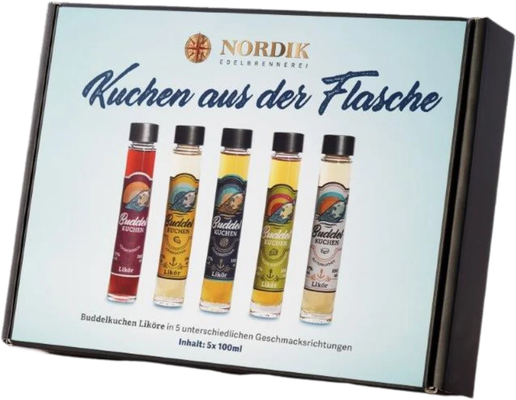 Buddelkuchen Probierpaket (1x Käsekuchen Likör + 1x Franzbrötchen Likör + 1x Apfelkuchen Likör + 1x Nussecken- Likör + 1x Schoko-Kirschkuchen Likör)