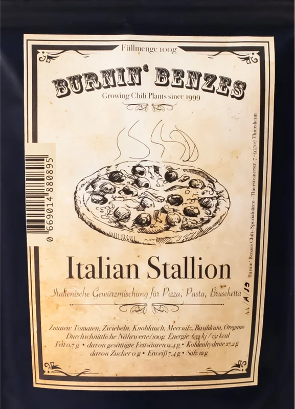 Alle Informationen zu Burnin‘ Benzes Italian Stallion Italian Stallion – da ist der Name Programm!Sehr leckere Gewürzmischung für Pizza, Pasta, Bruschetta und allen Arten von italienischen Gerichten.Hier stimmt alles: Eine herrliche Komposition aus fruchtigen und knusprigen Tomatenflakes, dazu ein hochwertiges Meersalz, abgerundet mit einer leichten Knoblauchnote und wunderbaren italienischen Kräutern.Perfekt für die frische Pizza aus dem Ofen, als Tischgewürz zum Nachwürzen von Pasta, Spaghettis, Bruschetta oder auch sehr lecker für das Salatdressing!Probiert auch mal eine feine leckere, mediterrane Butter damit zu machen. Nach Geschmack 2 bis 3 Löffel Italian Stallion auf 200 g Butter, dazu etwasKnoblauch und Zitrone – fertig ist die Itallian Stallion Butter!Das Produkt enthält keine tierischen Bestandteile, ist vegetarisch und glutenfrei.Dosierung nach Geschmack.