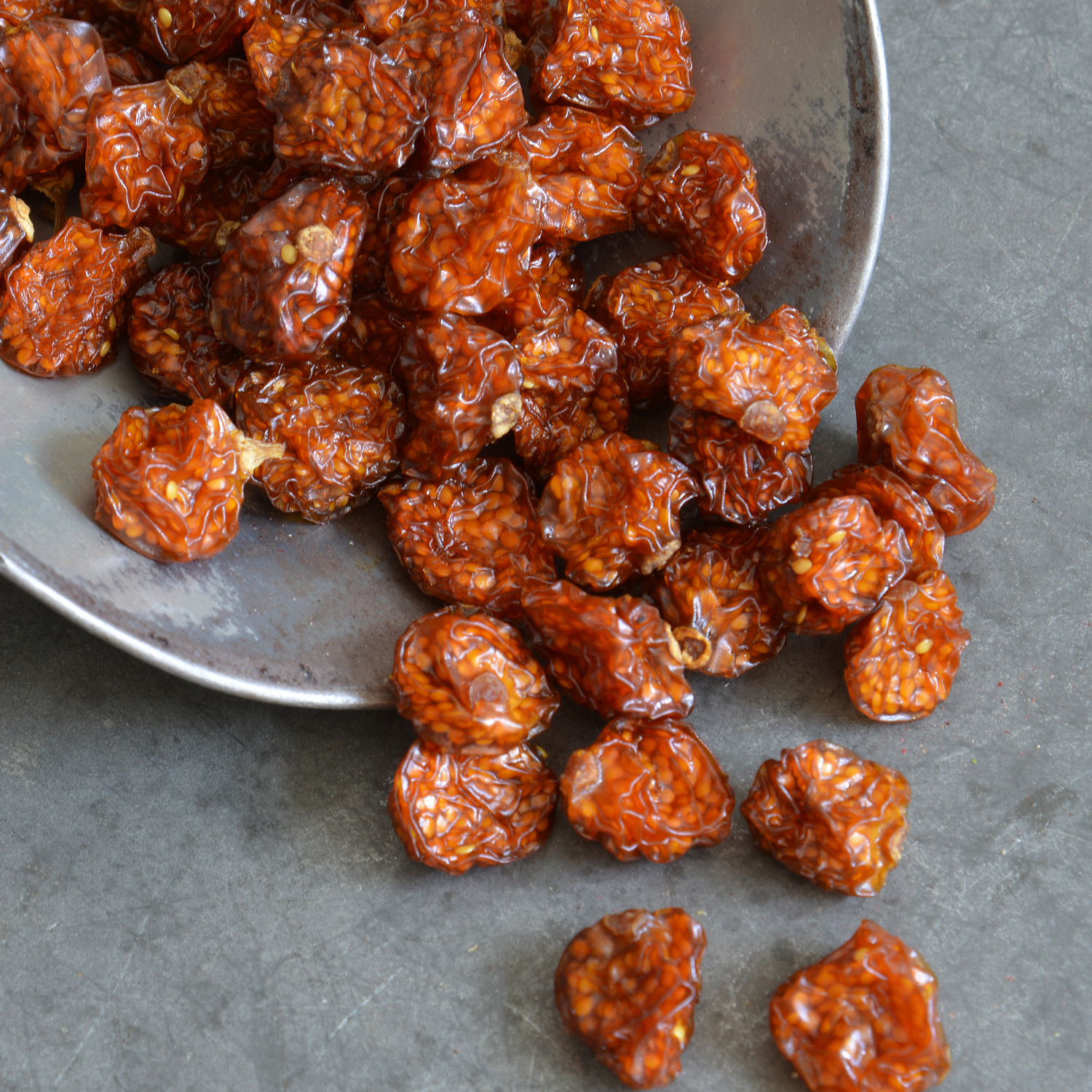The orange-red organic Cape gooseberries are dried without sugar and additives. Also known as physalis or Andean berry, these cherry-sized berries delight with their typical sweet and sour taste, which becomes even more intense through drying. A delight with other berries and nuts as an energy provision for hikes, in muesli, or as a compote for vanilla ice cream or parfait.