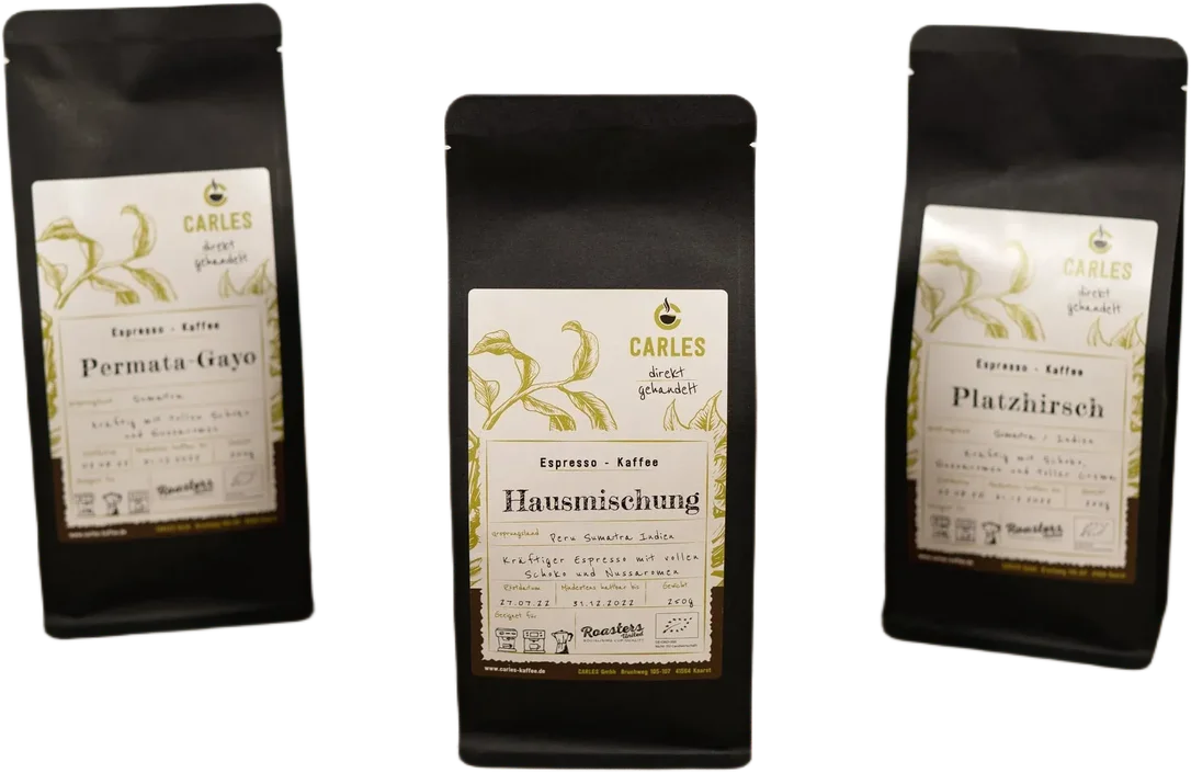 Alle Informationen zu Carles Bio Espresso Entdecker Set Kräftig Unser Entdecker-Set bietet dir die Möglichkeit, 3 besondere Espressi kennenzulernen! Die wohl angenehmste Art sich entscheiden zu können oder einem lieben Menschen eine Freude zu machen.In diesem Set bekommst du kräftige Espressi mit tollen Schoko und Nussaromen! Geeignet für: Siebträger, Herdkännchen und VollautomatDas ist im Paket enthalten1x Platzhirsch Espresso Blend Bio – 250gDer Platzhirsch ist eine kräftige & starke Mischung aus Permata-Gayos Zartbitter/Macademia Nuss Aromen sowie den nachhaltigen Schoki, Vanille und Mousse au chocolate Aromen des Robustas von Wayanad Organic aus Indien. Ein ausbalancierter Espresso für den Espressopuristen sowie für alle Liebhaber von Cappuccino … und das mit einer Crema die dich begeistern wird!Anbauregion: Kerala, Indien & Sumatra IndonesienAnbauhöhe: Hochlandkaffee1x Permata Gayo Bio Espresso Arabica – 250gSo stark und kraftvoll kann ein 100%iger Arabica schmecken – wow! Unser Espresso Permata-Gayo Espresso überzeugt mit Kakao und Macadamia Aromen. Was für viele von euch ja auch wichtig ist: Dieser Espresso hat fast keine/bis keine Säuren!Anbauregion: Sumatra, IndonesienAnbauhöhe: Hochlandkaffee1x Hausmischung Espresso Blend Bio – 250gSo stark und kraftvoll kann ein 100%iger Arabica schmecken – wow! Unser Espresso Permata-Gayo Espresso überzeugt mit Kakao und Macadamia Aromen. Was für viele von euch ja auch wichtig ist: Dieser Espresso hat fast keine/bis keine Säuren!Anbauregion: Cajamarca, Guatemala & Kerala, Indien & Sumatra, IndonesienAnbauhöhe: Hochlandkaffee