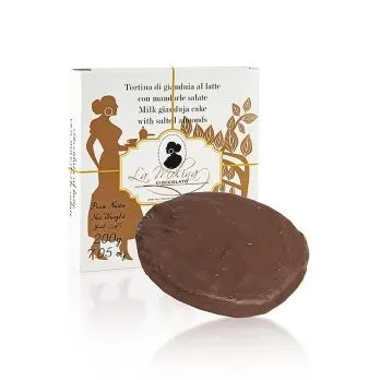 Milchschokoladen Gianduja mit gesalzenen Mandeln. Zutaten: mind. 34% Gianduja (18% IGP Piemont HASELNÜSSE, Zucker, Kakaobutter, Kakaopulver, VOLLMILCHpulver, Emulgator: SOJALECITHIN), MILCHschokolade Kakaoanteil mind. 36% (Zucker, Kakaobutter, VOLLMILCHpulver, Kakaomasse, Emulgator: SOJALECITHIN, natürliches Vanillearoma), mind. 20% gehackte MANDELN, Zucker, Kakaobutter, VOLLMILCHpulver, Kakaomasse, Emulgator: SOJALECITHIN, natürliches Vanillearoma. Kühl & trocken lagern. Hergestellt in Italien.Eigenschaften: Eiweiß aus tierischer Milch.