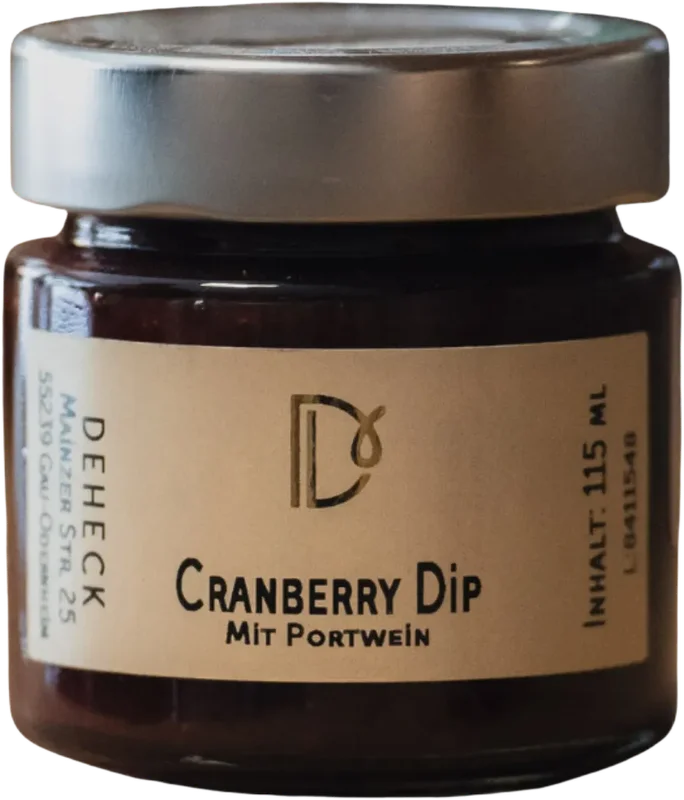 Alle Informationen zu Deheck Manufaktur Cranberry Aufstrich mit Portwein Dieser unwiderstehliche Cranberry Dip ist ein wahrer Genuss für Feinschmecker. Die fruchtig-säuerliche Note der Cranberry trifft auf die edle Note von Portwein.Unser Feinkost Aufstrich ist nicht nur perfekt für Brot und Brötchen, sondern auch ein idealer Begleiter zu Käseplatten, Fleischgerichten oder als raffinierte Ergänzung zu Desserts.Inhalt Cranberry Portwein Dip: 115 ml