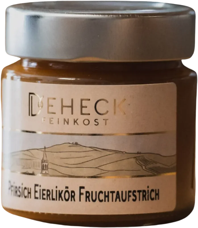 More information about Deheck Manufaktur peach eggnog spread The sweet freshness of the aroma of juicy peaches meets the creamy seduction of egg liqueur.A truly unique taste experience that unfolds in every spoonful of our delicatessen fruit spread.The harmonious combination of fruity sweetness and the subtle hint of alcohol makes this peach eggnog spread a real treat.Contents of peach eggnog spread with shot: 140 g