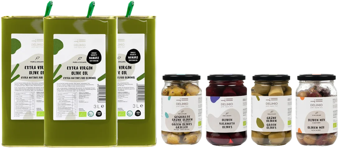 Alle Informationen zu DELINIO Manaki Olivenöl Vorratspaket WIR HABEN DIESES JAHR EINE SEHR GERINGE MENGE VERFÜGBAR. NUR SOLANGE VORRAT REICHT, FRISCHE ERNTE.Ein ganz besonderes extra natives Bio Olivenöl. Die Sorte Manaki ist eine der fruchtigsten Griechenlands.Mando hat den Hain von ihrem Vater geerbt und der wiederum von seinem Vater. Inzwischen ist es die 4. Generation. Die „jüngsten“ Olivenbäume sind ca. 80-100 Jahr alt, und die „älteren“ wohl schon einige Jahrhunderte. Das Gut kann nach Voranmeldung besucht werden.Ein Olivenöl der Premium Klasse, direkt aus Oliven ausschliesslich mit mechanischen Verfahren gewonnen. Kalt extrahiert. Die Oliven werden früh geerntet, wenn sie noch grün sind.Das DELINIO Manaki Bio-Olivenöl ist etwas Besonderes und sicher ein Tipp um sich damit mit dem Jahresbedarf ein zu decken.Als ausgebildeter Olivenöl Verkoster garantiert der Gründer von Delinio, dass man mit diesem Öl nichts „falsch machen kann“, es hat keinerlei sensorische Fehler. Es kann sowohl zum kochen genommen werden aber auch natürlich „pur“, z. Bsp. auf gekochtem Gemüse oder Kartoffeln! Oder auf jeden Löffel Linsen oder in die Suppe einige Tropfen tun.Mittel– bis intensiv fruchtig im Geschmack. Man spürt im Mund die bitteren Noten und auch die Schärfe im Abgang.Dieses Paket enthält:DELINIO Extra Natives Bio Olivenöl Manaki – Ernte 23/24 – je 3 lZutaten: kalt extrahiertes Olivenöl* *aus Óliven aus biologischem AnbauNährwerte pro 100 ml: Energie: 3389 kJ/824 kcal | Fett: 91,6 g | davon gesättigte Fettsäuren: 12,8 g | davon einfach ungesättigte Fettsäuren: 70,5 g | davon mehrfach ungesättigte Fettsäuren: 8,3 g | Kohlenhydrate: 0 g | davon Zucker: 0 g | Eiweiß: 0 g | Salz: 01x GRATIS DELINIO Oliven Mix mariniert, ohne Stein – 370 gGrüne Bio-Oliven und Bio-Kalamata-Oliven, beide entsteint, und mit Kräutern mariniert.Zutaten: Grüne Oliven* (50%), Kalamata Oliven* (49%), Salz, Olivenöl* (0,4%), Thymian*, Oregano*, Rosmarin* *Biologische LandwirtschaftNährwerte pro 100 ml: Energie: 835 kJ/200 kcal | Fett: 19,8 g | davon gesättigte Fettsäuren: 2,9 g | Kohlenhydrate: 1,6 g | davon Zucker: 0 g | Proteine: 2,2 g | Ballaststoffe: 4,1 g | Salz: 3,4 g1x GRATIS DELINIO Gegrillte grüne Oliven mariniert, ohne Stein – 370 gGrüne, entsteinte Oliven gegrillt und mit Kräutern mariniert.Zutaten: Gegrillte grüne Oliven* (95%), Meersalz, Essig*, Natives Olivenöl* (0,4%), Bukovo*; Thymian*, Oregano*, Rosmarin*, Basilikum*, Knoblauch* *Biologische LandwirtschaftNährwerte pro 100 ml: Energie: 776 kJ/188 kcal | Fett: 19,1 g | davon gesättigte Fettsäuren: 3 g | Kohlenhydrate: 1,9 g | davon Zucker: 0,2 g | Proteine: 1,4 g | Ballaststoffe: 1,7 g | Salz: 3,5 g1x GRATIS DELINIO Grüne Bio Oliven – 314 gUnsere Bio Oliven werden natürlich entbittert – eine Vorgang der Monate dauert. Es werden keinerlei Chemikalien verwendet um den Prozess zu beschleunigen. Das Ergebnis schmeckt man.Zutaten: Grüne Oliven* der Sorte Amfissis, Wasser, Salz *Aus biologischem AnbauNährwerte pro 100 ml: Energie: 488 kJ/118 kcal | Protein: 1,2 g | Fett: 12,4 g | davon gesättigte Fettsäuren: 2,1 g | Kohlenhydrate: 0,5 g | davon Zucker: 0,1 g | Ballaststoffe: 3,8 g | Salz: 1,7 g1x GRATIS DELINIO Kalamata Bio Oliven – 314 gDie weltberühmten Oliven aus Kalamata! Einfach Klasse. Als kleine Vor-Vorspreise, zwischendurch oder als Zutat, nicht nur zum griechischen Salat….mit dem ja alles began. Unsere Oliven werden, wie früher bei meiner Oma, über Monate hinweg entbittert. Da kommen keinerlei Chemikalien zum Einsatz um den Prozess zu beschleunigen. Und den Unterschied, den schmeckt man.Zutaten: Kalamata Oliven*, Wasser, Salz *aus biologischem AnbauNährwerte pro 100 ml: Energie: 1041 kJ/852 kcal | Protein: 1,3 g | Fett: 26,7 g | davon gesättigte Fettsäuren: 3,1 g | Kohlenhydrate: 1,8 g | davon Zucker: 0,1 g | Ballaststoffe: 6,3 g | Salz: 1,7 g