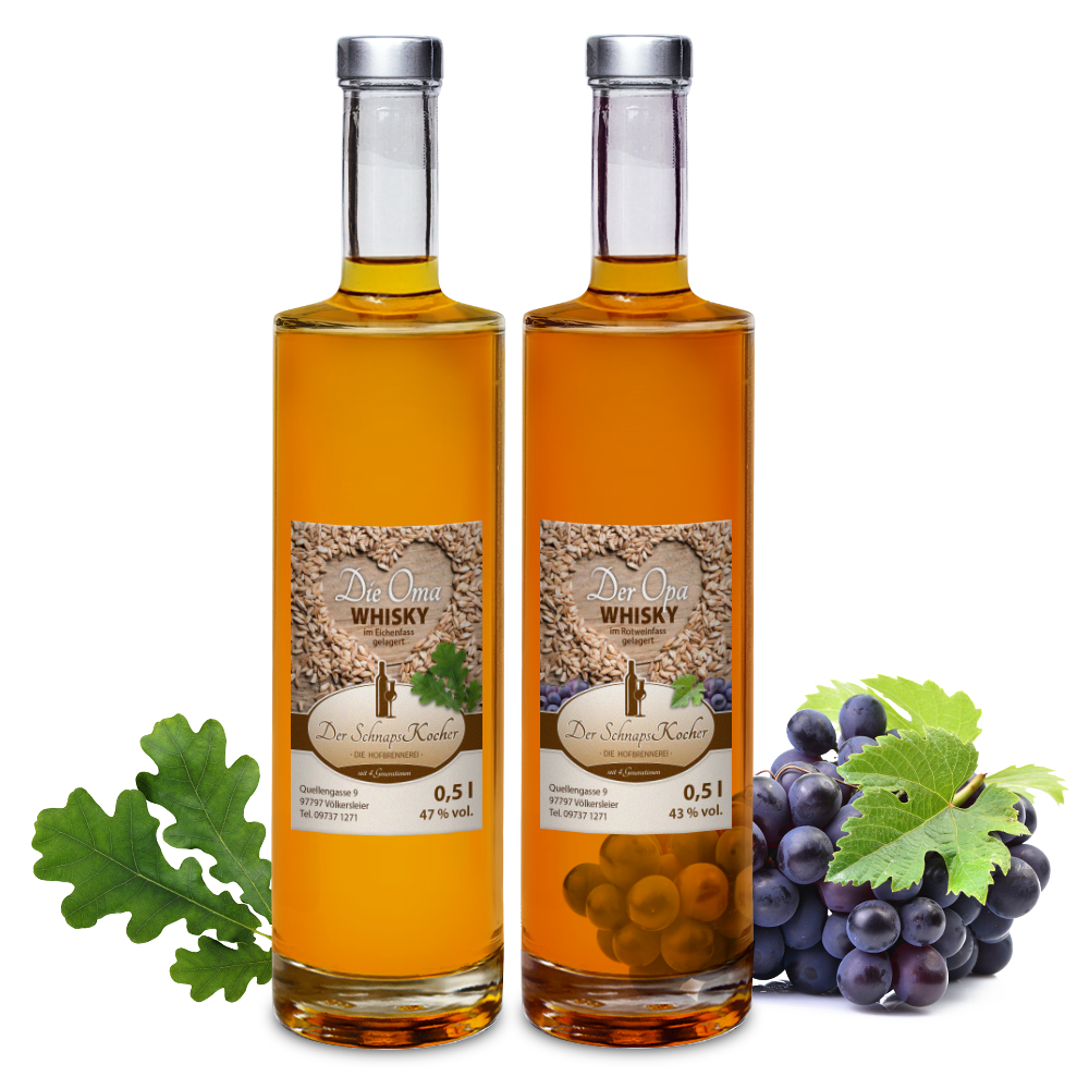 je 0,5 l – DIE OMA – Whisky aus dem Eichenfass mit Vol. 47% und DER OPA – Whisky aus dem Rotweinfass mit Vol. 43%