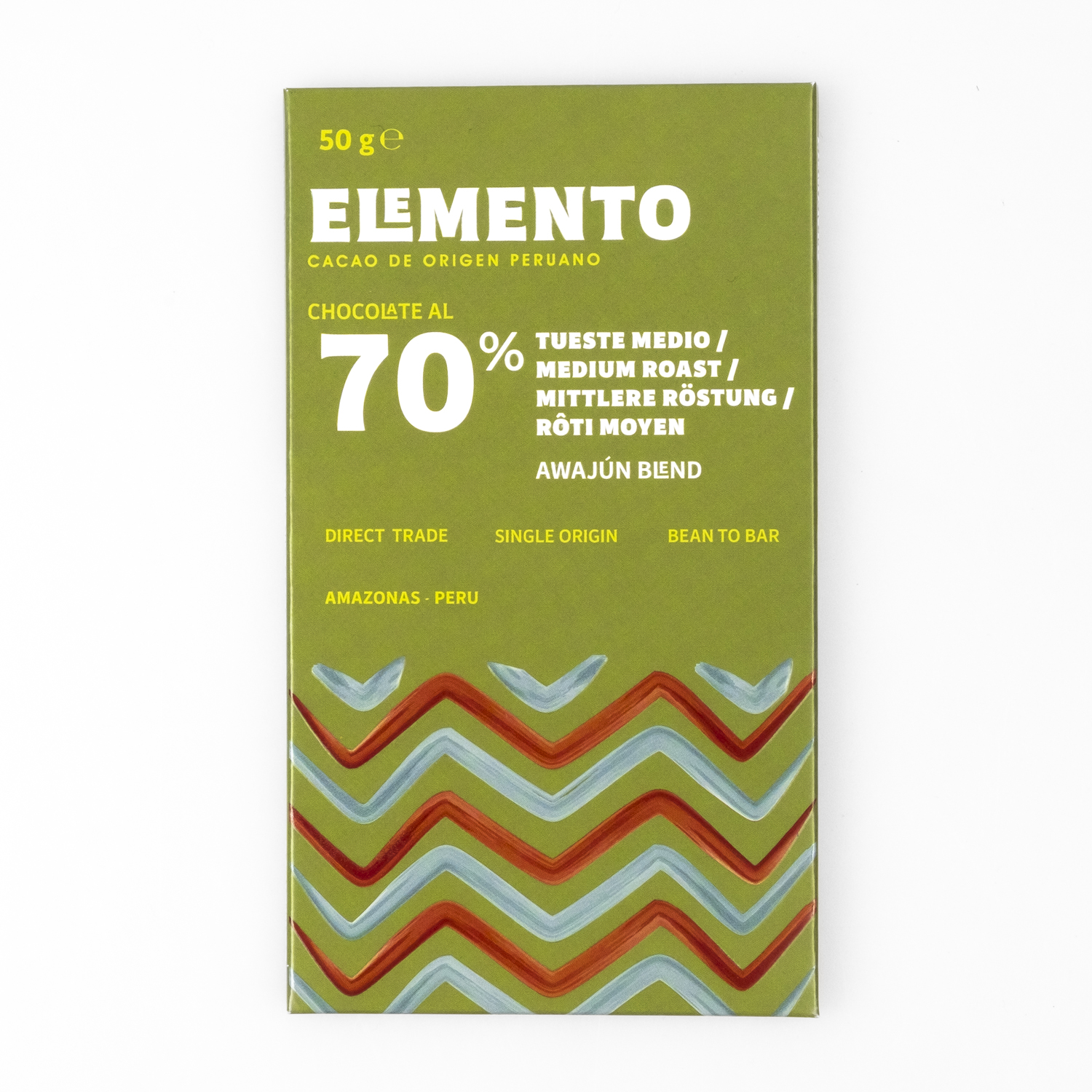 Elemento Chocolate verarbeitet in Lima, Peru, aromatischen Edelkakao der indigenen Awajún aus dem peruanischen Amazonasgebiet. Über 500 Kleinbauern profitieren von fairen Preisen, Schulungen und Fermentationszentren, während sie durch traditionelle Agroforstwirtschaft den Regenwald erhalten. Besonders sorgfältig werden die Bohnen geröstet: Für jede Schokolade entwickelt Elemento eigene Röstkurven, um charakteristische Aromen hervorzuheben. Mit der „Trilogie der Röstung“, leichte, mittlere und dunkle Röstung, lässt sich der Einfluss der Röstprofile direkt erschmecken. Ergänzt wird die Serie durch eine dunkle Schokolade, die mit Panela, einem unraffinierten Vollrohrzucker, gesüsst ist.