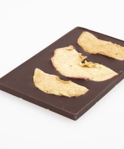 Getrockneter Fuji-Apfel, bestäubt mit Ceylon-Zimt, schmückt die cremige 56%ige Haferschokolade aus Bio-Kakao aus dem Semuliki-Wald in Uganda.