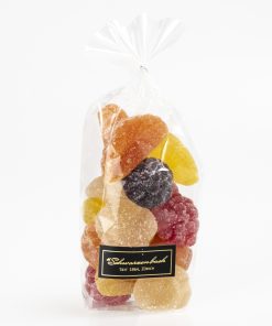 Feine Geléefrüchte in den Geschmacksrichtungen Apfel, Orange, Zitrone, Ananas, Himbeere und Brombeere. Eignet sich sehr gut als kleines Mitbringsel.