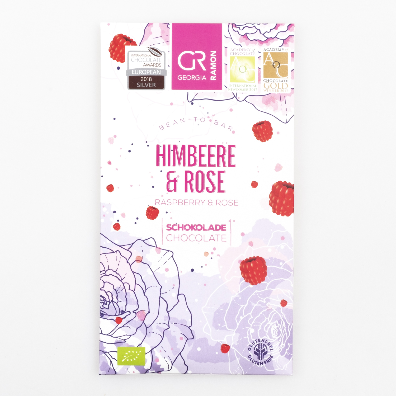 Weisse, bzw. rote Schokolade, veredelt mit aromatisch-fruchtigen Himbeeren und kostbarem, bulgarischem Rosenöl. Die Himbeeren werden reif und mit vollem Aroma geerntet und sofort gefriergetrocknet. Dadurch bewahren sie ihr volles fruchtig-beeriges Aroma.