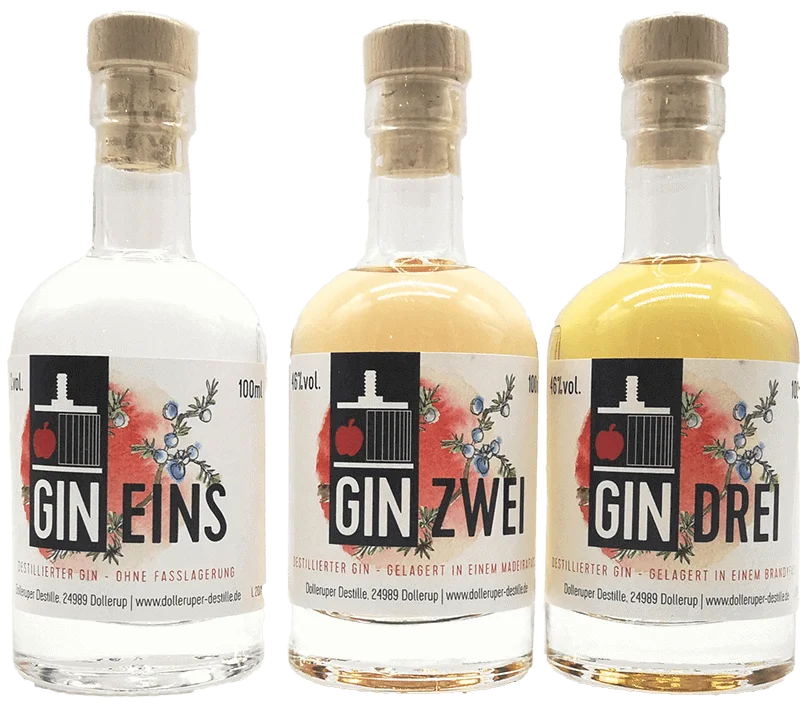 More information about Gin Trio Our new GIN TRIO is here. The base product for all three bottles is a triple-distilled gin with ground juniper, sea buckthorn, citrus fruits, hibiscus and selected regional berries. The second and third gin were each stored in a barrel for over a year. The different color and flavor nuances are therefore only due to the different barrel storage of GIN TWO and THREE.Gin One: without barrel ageingGin Two: stored in a Madeira barrelGin Three: aged in a brandy caskAll three gins were bottled at 46% vol.