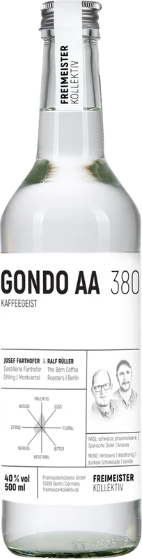 More information about GONDO AA 380 GONDO AB 381 is another joint project by Ralf Rüller, specialty coffee pioneer from Berlin, and Josef Farthofer, organic farmer and distiller from Austria.Aroma: Blackcurrant | Spanish cedar | pineappleTaste: Raspberry | VanillaFinish: dark chocolate | forest honeyCoffee spirit 40 % vol.