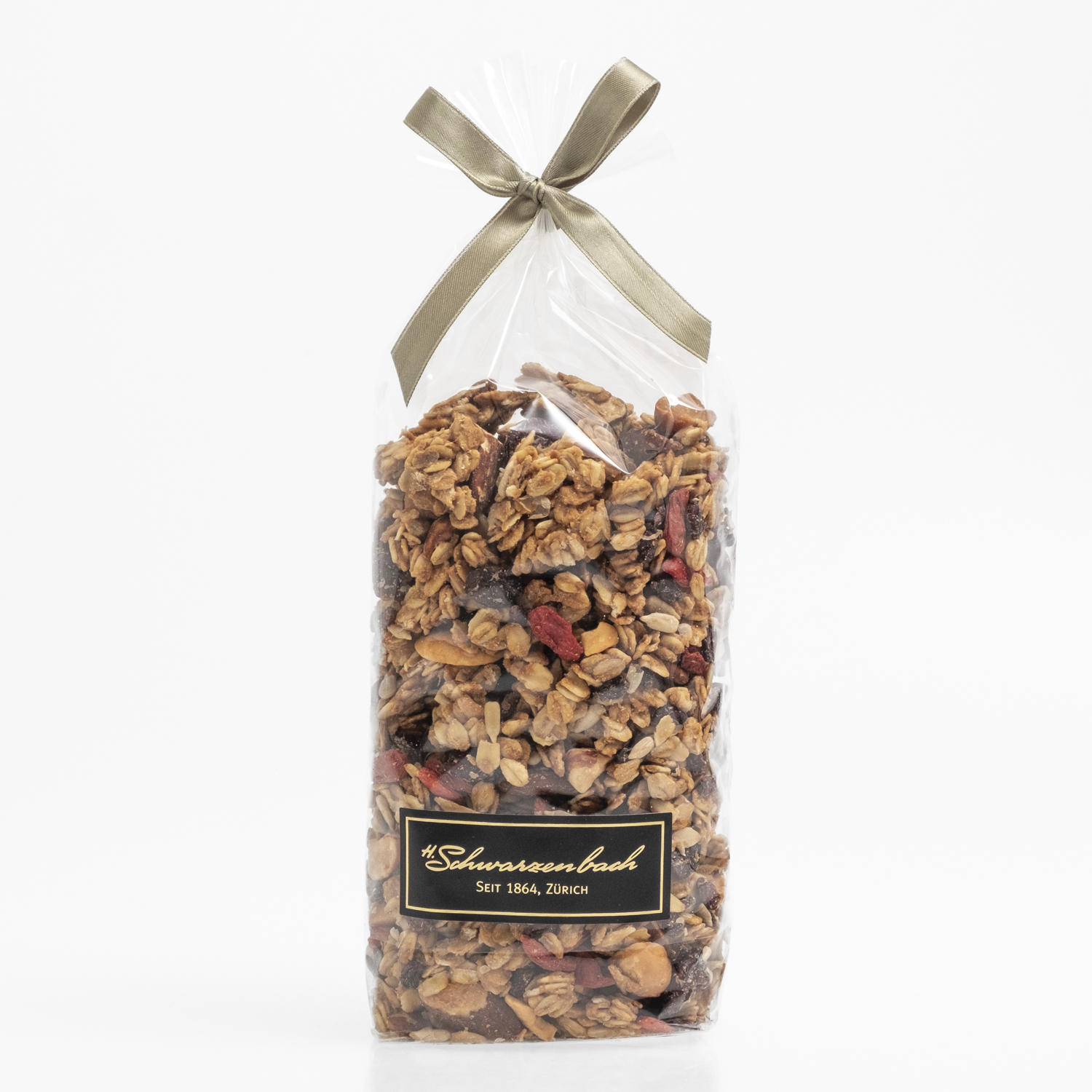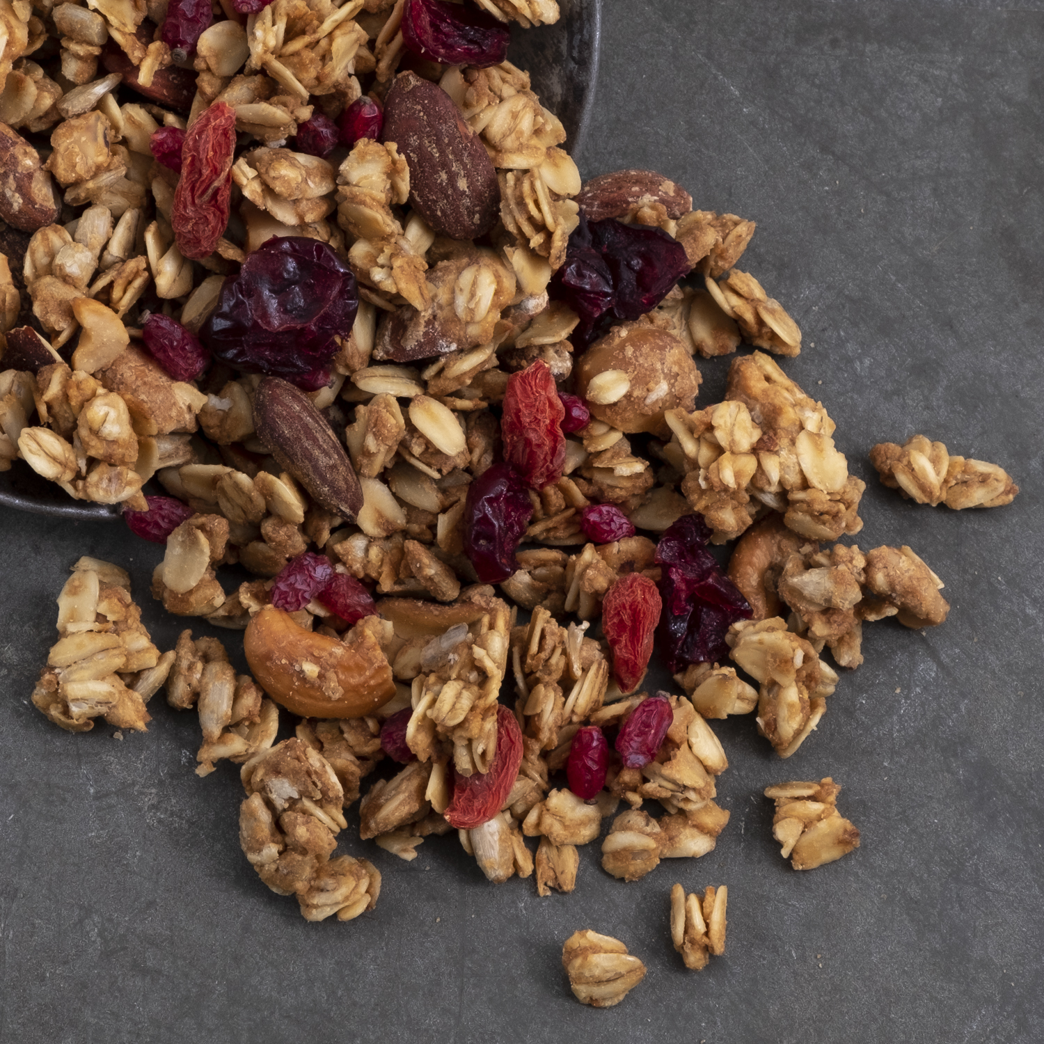 Our delicious granola is produced exclusively for us by the Tiny Factory in Zurich. Freshly roasted flake and nut mix, mildly sweetened with maple syrup and refined with tasty barberries*, goji berries* and cranberries*.