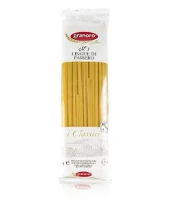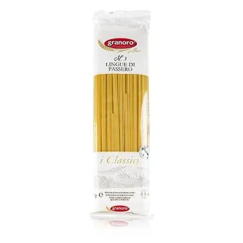 Die Italiener kennen eine Vielfalt von Bandnudeln, wobei jeweils eine unterschiedliche Breite den Unterschied macht. Linguine, Lingue di Passero, Tagliatelle, Fettuccine etc. Lingue di Passero sind mit 3 mm die zweitschmalsten Bandnudeln aus unserem Sortiment. Diese Pasta stammt aus Italien, wird aus bestem Hartweizengrieß, jedoch ohne Eier hergestellt.