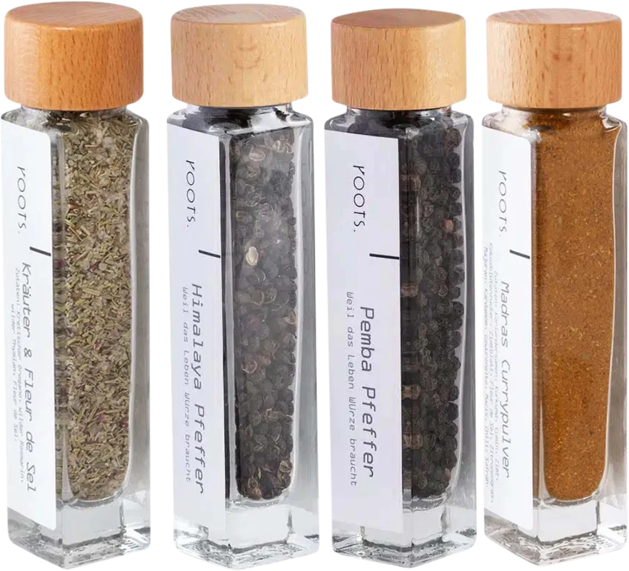 Alle Informationen zu Grillgewürze 4er Probierpaket Aromatische Grillgewürze kaufen zum Würzen oder als schönes Gastgeschenk. Mit unseren Grillgewürzen lassen sich viele Speisen verfeinern, ganz gleich ob Grillgemüse, Tofu, Käse, Fisch oder Fleisch.Bei roots. wird jedes Gewürz direkt vor Ort eingekauft. Es gelten höchste Anforderungen an Qualität und Nachhaltigkeit für den besonderen Genuss auf dem Grill oder zu anderen Speisen.Das ist im Paket enthalten1x Himalaya Pfeffer – 17 gErlebe einzigartige Aromen mit Noten von Citrus, Grapefruit, Orange und Mango sowie eine leicht betäubenden Schärfe beim Genuss von Himalaya-Pfeffer. Der wilde und aufwendige von Hand sortierte Himalaya-Pfeffer kommt direkt aus der Natur in Nepal. Dieser Himalaya-Pfeffer schmeckt einzigartig, belebt die Energie und Lebensfreude.Geschmack: fruchtige Zitrusnoten, Mango, leicht betäubende Schärfe1x Schwarzer Pemba Pfeffer – 30 gPemba-Pfeffer ist ein schwarzer Pfeffer. Aber eben kein gewöhnlicher, sondern von Hand sortiert und so aromatisch. Pemba-Pfeffer schmeckt nussig, fruchtig und angenehm scharf. Im prämierten Bio-Urwaldpfeffer von Tansanias Inseln kommt die ganze Kraft und Vielfalt der Natur zur Geltung.Geschmack: nussig, fruchtig, angenehme Schärfe1x Madras Curry Gewürzmischung – 30 gEine aromatisch-würzige Mischung aus Südindien für den kulinarischen Einstieg in die Currywelt. Im Madras Currypulver vereinen sich Schärfe und Süße mit erdigen Gewürzen wie Koriander & Kreuzkümmel verfeinert mit den Aromen von Safran, Kardamom & Macis. Die süß-scharfen und zugleich blumig-frischen Aromen harmonieren wunderbar mit Kokosmilch oder geben zum Ende der Kochzeit vielen Gerichten eine tolle Würze.Geschmack: erdig-würzig, feine Süße, angenehme SchärfeZutaten: Koriandersamen, Kurkuma, Kreuzkümmel, Zimt, Kokosblütenzucker, Zimtblätter, Fleur de Sel, Zitronengras, Majoran, Kardamom, Gewürznelke, Macis, Chili, Safran1x Kräutersalz – 25 gDas Kräutersalz enthält hochwertige getrocknete mediterrane Kräuter und wird zusammen mit Fleur de Sel aus der Algarve frisch gemischt. Da der Salzanteil verhältnismäßig gering ist, bei Bedarf nach Belieben nachsalzen. Unser Kräutersalz passt fast überall dazu und schmeckt mit etwas Olivenöl, Balsamico und Pfeffer bereits wunderbar.Geschmack: mild, tolle KräuternoteZutaten: Kretischer Oregano, wilder Rosmarin, wilder Thymian, Fleur de SelOptional kannst du zu den Gewürzsets auch noch einen passenden Gewürzständer aus edlem Eichenholz bestellen.