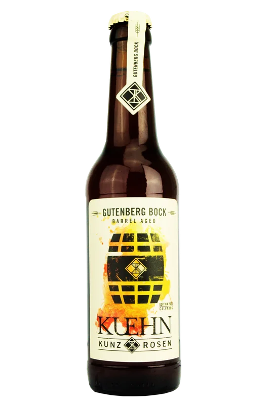More information about Gutenberg Bock Barrel Aged The fine Gutenberg Bock from Kuehn Kunz Rosen is a real beer specialty in itself: soft notes of full-bodied malt and winter spices provide a sense of well-being for the soul, while the strong revolutions provide a wonderful warmth that spreads tinglingly throughout the body. However, the creative brewers have now decided to fully exploit the potential of their bock beer and refine it further by maturing it in barrels.After the first version was snapped up like hot cakes by the brewers, we were fortunately able to secure a few more copies. The second version is now available, but we are still indulging in the sensual aroma of the first. The Gutenberg Bock was aged for six long months in aromatic former Calvados wooden barrels. During this time, the barrel’s own flavors enriched the profile of the bock with an intense depth and complex hints of oak, fine brandy and tangy green apples. The fine apple brandy harmonizes wonderfully with the tart spiciness of the bock and also provides an exquisite vanilla aroma.The beer specialty flows into the glass in the color of liquid caramel and smells just as good: soft toffee notes, baked apple aromas, warm Calvados notes, vanilla, wood and strong malt dominate the aroma and taste.