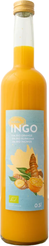 More information about Hannheinehof Mild Ingo The mild INGO is the calm itself! Why? Because it combines the freshness of 72% organic orange, the power of 12% organic turmeric and the mild spiciness of 6% organic ginger.The mild Ingo is like the little brother of the hot Ingo. It is a little milder, a little fruitier, a little sweeter. However, it is in no way inferior to the spicy INGO . It is just as pure and delicious!