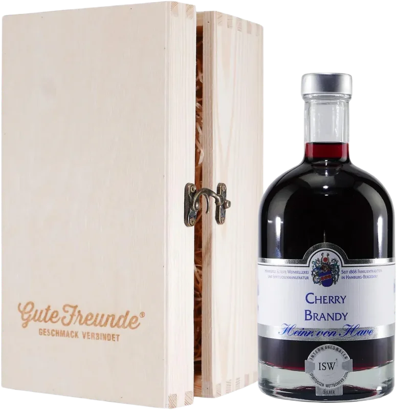Alle Informationen zu Heinr. von Have Cherry Brandy mit Geschenk-Holzkiste Cherry Brandy ist Kirsche pur! Es ist eine hochwertige, besondere und klassische Art des Kirschlikörs. Hier wird nicht nur der Saft vollaromatischer Weichselkirschen, sondern auch hochwertiges Schwarzwälder Kirschwasser verwendet. Auf weitere Zutaten zur Geschmackssteigerung und Veredelung wird ganz bewusst verzichtet. Die Weinkellerei und Spirituosen-Manufaktur Heinr. von Have wurde im Jahre 1868 gegründet und ist heute die älteste und einzige, familiengeführte historische Weinkellerei und Spirituosen Manufaktur Hamburgs mit funktionierender Kellerwirtschaft.Wie es für viele Kellereien des Nordens üblich war, wandte man sich zur Vervollständigung des Angebotes für die regionale Gastronomie mit dem Eintritt in das 20. Jahrhundert der Spirituosen Destillation zu. Seit über 100 Jahren verarbeitet und produziert die Spirituosen-Manufaktur nach alten Familienrezepten in kleinen Partien edle Destillate. Auf traditionelle Art und Weise werden diese noch heute per Hand hergestellt, geschmacklich abgestimmt und einzeln auf die Flasche gefüllt. Über die Hälfte der klassischen Spirituosen ist durch internationalen Spirituosen Wettbewerbe mit höchsten Auszeichnungen bewertet worden. Ausgewählte Liköre in der GUTE-FREUNDE Holzkiste schenken – denn Geschmack verbindet. Rechtlicher HinweisAb 18! Dieses Produkt enthält Alkohol und darf nicht an Personen unter dem gesetzlichen Mindestalter abgegeben werden. Eine Lieferung an Minderjährige ist nicht möglich. Mit deiner Bestellung bestätigen Sie, dass Sie das gesetzlich vorgeschriebene Mindestalter haben. Bitte seien Sie verantwortungsvoll im Umgang mit diesem Artikel. Weitere Informationen unter kenn-dein-limit.info. Es wird keine Gewähr dafür übernommen, dass der gelieferte Artikel vollkommen identisch mit dem auf dem Online-Angebot gezeigten Bild ist. Dies gilt in besonderem Maße für nummerierte Abfüllungen, Jahrgänge und für Änderungen von Flaschenausstattungen und Verpackungen, die einem lieferantenseitigen Wechsel unterworfen sind. Bei den Bildern handelt es sich um Beispielbilder, die wesentlichen Merkmale des Artikels befindet sich in der Artikelbeschreibung.Der Markenname ist Eigentum des Rechteinhabers. Die Verwendung des Markennamens dient hier lediglich der Indentifizierung der Ware sowie der Kennzeichnung der Qualität und soll keineswegs eine Schutzrechtsverletzung darstellen.Inverkehrbringer: Heinr. von Have GmbH & Co. KG, Sachsentor 32, 21029 Hamburg, Deutschland