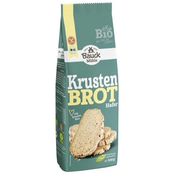 Krustenbrot Backmix. Eine glutenfreie Backmischung der Bauckhof Mühle für köstliches Krustenbrot auf Basis von Hafermehl. Ergibt ca. 825g Brot.