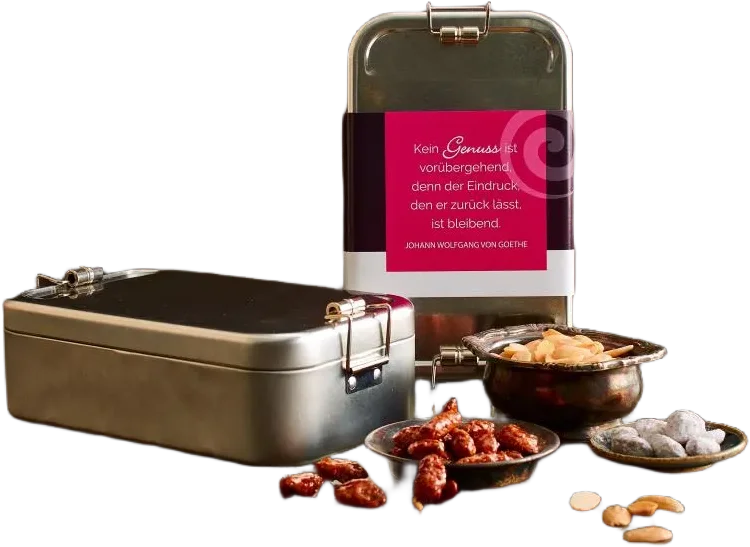 Alle Informationen zu Lunchbox mit Mandeln Wenn die Verpackung ein Teil des Geschenkes ist kann man wirklich von Nachhaltigkeit sprechen! Eine zeitlose Lunchbox mit einem Mix aus Mandeln gefüllt muss man nicht nur verschenken, man darf auch selber naschen.Das ist im Paket enthalten1x Original Jahrmarktsmandeln – 100gIm Kupferkessel werden die spanischen Mandeln mit wenig Zucker gerührt, bis Sie knacken – erst dann bekommen Sie eine schöne Glasur. Traditionell hergestellt – wie zu Opas Zeiten!Zutaten: Mandeln*, Zucker, Wasser*ALLERGENENährwerte pro 100g: Energie: 2077 kJ/495 kcal | Fett: 27 g | davon gesättigte Fettsäuren: 2,7 g | Kohlenhydrate: 53 g | davon Zucker: 53 g | Eiweiß: 10 g | Salz: 0 g 1x Mandeln mit Meersalz – 100gDas Geheimnis der Gourmet Mandel ist die feine Süße, die der Frucht einen leichten Glanz verleiht und in der Kombination mit Meersalz einfach himmlisch schmeckt.Zutaten: Mandeln*, Zucker, MeersalzWasser*ALLERGENENährwerte pro 100g: Energie: 2382 kJ/569 kcal | Fett: 48,4 g | davon gesättigte Fettsäuren: 4,8 g | Kohlenhydrate: 12,8 g | davon Zucker: 12,8 | Eiweiß: 21,9 g | Salz: 1,2 g 1x Gebrannte Mandeln mit Vanille – 100gVon einer Familienfarm aus Madagaskar kommt die Bourbon Vanille, die mit Puderzucker vermischt und dann über die knackig gebrannten Mandeln gesiebt wird – hauchdünn, aber mit einem harmonischen Aroma.Zutaten: Mandeln*, Zucker, PuderzuckerBourbon Vanille, Wasser*ALLERGENENährwerte pro 100g: Energie: 2014 kJ/481 kcal | Fett: 24,5 g | davon gesättigte Fettsäuren: 2,5 g | Kohlenhydrate: 55,4 g | davon Zucker: 53,3 g | Eiweiß: 9,1 g | Salz: 0 g1x Lunchbox mit Schmuckbanderole185x110x54 mm