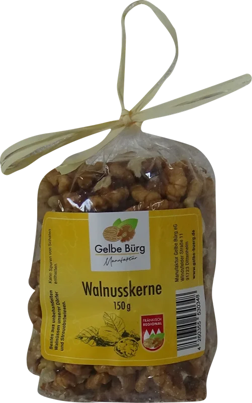 More information about Manufaktur Gelbe Bürg Franconian walnut kernels The fine walnut kernels come from 100% Franconian walnuts that ripen in home gardens and orchards. They are collected exclusively by hand.The manufactory checks the quality as soon as they are purchased. Only the best are put into the bag after cracking. Each kernel is checked and carefully packed by hand. Vegan!