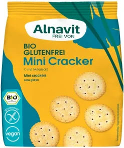 Die glutenfreien und veganen Mini Cracker von Alnavit sind mit Meersalz bestreut und ein knuspriger Snack für zwischendurch. Hochwertige Zutaten wie Buchweizen- und Kichererbsenmehl machen sie zu einer Ballaststoffquelle. Geschmacklich überzeugen die Bio-Cracker durch eine feine Mohnnote – toll für unterwegs oder mit einem leckeren Dip.