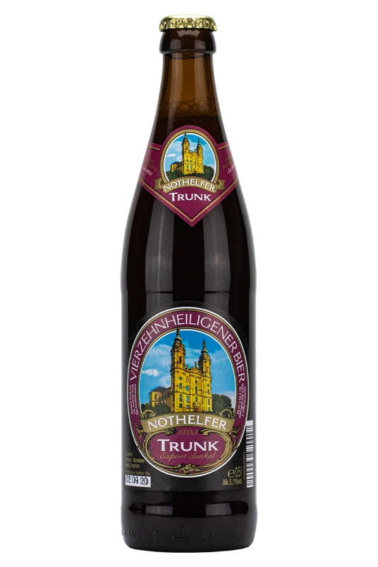 More information about Nothelfer Trunk Export Dark In the past, malt was still kilned over beechwood and there was hardly any beer other than dark, smoky beer. With technical progress, there were more opportunities to produce malt in other ways and dark beer fell into oblivion. Except in Franconia. Dark beer is still an absolute must in Franconia today and is a favorite of many beer lovers. Most breweries stock this specialty beer and also have a few culinary delicacies on offer that go perfectly with it.The Trunk brewery from Vierzehnheiligen near Bad Staffelstein is no exception: its Nothelfer Export Dunkel is one of the best-known beers in its range and you can enjoy home-made Franconian delicacies in the brewery’s own beer garden or Braustüberl. With or without accompaniment, their dark beer is an absolute delight.This classic presents itself in a shimmering rust-red chestnut brown in the glass and is crowned with a generous amount of ivory-colored foam. The 5.1% beer is almost clear thanks to filtration and smells wonderfully of oven-fresh bread crust, sun-ripened grain, roasted malt and brown sugar when poured. A hint of juicy apple and spicy licorice round off the first olfactory impression and lead to a delightful finish. The Vierzehnheiligener Nothelfer Trunk tastes finely roasted, strongly malty, wonderfully nutty and slightly chocolaty. The bitterness of a good espresso rounds off the taste experience.