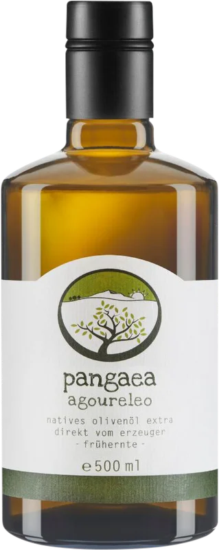 More information about Pangaea Early AGOURELEO extra virgin olive oil A premium class fruity olive oil from early harvested olivesOlive oil directly from the producerEarly harvest (approx. September 20 to October 10)Medium fruity with fresh, green aromas, a medium bitter note and subtle spicinessexclusively for cold dishesCertified quality: first gradesustainably grown and harvested by handcold-extracted (max. 27 °C), exclusively using mechanical processesevenly tempered, airtight storage under a protective atmosphere in an INOX tankAgoureleo – First-class extra virgin olive oil of the highest quality from the early harvestThe word Agoureleo comes from the Greek words ágouros and éleon, which means unripe oil. Agoureleo is made from fresh, green, unripe olives and is completely natural. Our olives are lovingly harvested exclusively by hand. We do not use any tools or nets and harvest directly into the crate. We do not use damaged fruit or fallen fruit. Harvest time is September and October, when the olives are still green and unripe.Mild, delicious olive oil with a very low acidity and a plus in polyphenolsLike our Pangeaa extra virgin olive oil, our Pangaea Agoureleo has a very low acidity of less than 0.3%, well below the legal limit for extra virgin olive oils of 0.8%. It is delicious and at the same time rich in monounsaturated and polyunsaturated fatty acids as well as important vitamins and valuable minerals. Due to the early harvest, it is intensely fruity and has a higher proportion of polyphenols. This makes it a special, unique olive oil with added value for our health.Fine, aromatic olive oil for a conscious healthy diet, excellent for cold dishesWe recommend using our Pangaea Agoureleo exclusively in cold dishes. You can use it to refine your salads and dips, create an aromatic pesto or simply enjoy it with a piece of fresh white bread, some salt and oregano. The latter tastes particularly fruity and delicious. To preserve the valuable polyphenols as much as possible, you should not heat our Pangaea Agoureleo.Our Pangaea olive oils are natural. Any cloudiness caused by suspended matter is completely natural. Store in a cool, dark place and protect from direct sunlight.