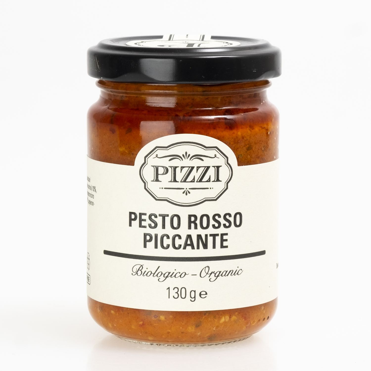 Pikantes rotes Pesto mit getrockneten Tomaten, Chili, Basilikum, Knoblauch und Pinienkernen aus biologischem Anbau. Ideal zu Teigwaren, auf Bruschette oder in Marinaden.