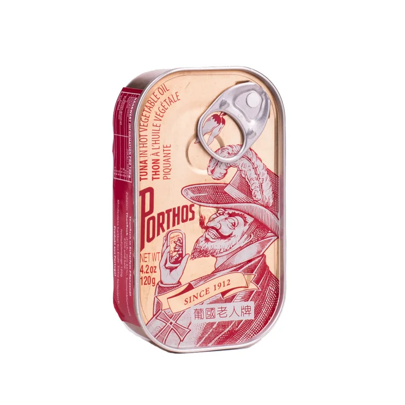 Porthos | Thunfisch in scharfem Würzöl Der Porthos Thunfisch in scharfem Würzöl das ist bester portugiesischer Thunfisch. Von Hand verarbeitet und in Sonnenblumenöl eingelegt, mit Piri Piri gewürzt und leicht gesalzen, dabei aromatisch im Geschmack und fest im Biss. Der Thunfisch ist köstlich als Vorspeise auf knusprigem Brot, als Zutat für ein Sandwich oder schmeckt toll als Beilage zu einem frischen, sommerlichen Salat. Noch dazu ist er ein guter Protein-Lieferant und lassen sich im Hand umdrehen servieren. Porthos | Thunfisch und Sardinen aus Portugal Die Manufaktur Porthos gehört zu den traditionellen Fischkonserven Produzenten in Portugal. 1912 gegründet verfügt das Familienunternehmen aus der Hafenstadt Matosinhos über mehr als 100 Jahre Erfahrung in der Verarbeitung von Fisch aus dem Atlantik und der Herstellung von bestem Thunfisch aus Portugal. Das traditionelle Porthos Design mit einem Seefahrer auf der Sardinendose gehört zu den ältesten des Unternehmens und wurde lediglich um ein paar neue Rezepturen und Farben ergänzt.