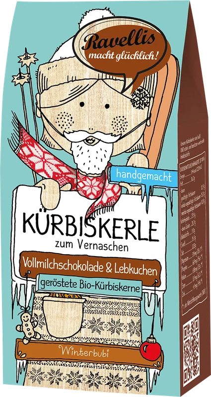 Ravellis Kürbiskerle – Winterbubi – Bio-Kürbiskerne mit Vollmilchschokolade & Lebkuchen