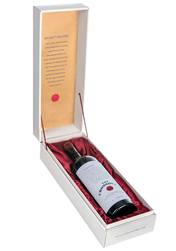 More information about Rickety Bridge The Crossover Pinotage 2019 The refined Rickety Bridge The Crossover Pinotage delights on the nose with light aromas of dark fruit and oak. On the palate, the red wine from South Africa’s national grape is velvety smooth and the tannins are well integrated. The grapes used for the complex Rickety Bridge The Crossover Pinotage, which is limited to 3010 bottles, come from Franschhoek and skillfully reflect the terroir. Spicy dishes, duck, dark meat or game are an excellent choice with this red wine, which has matured for 24 months in French oak. But Rickety Bridge The Crossover Pinotage is also a delight on its own. Incidentally, the „Crossover“ in the name stands for the crossing of the bridge that leads to the winery, because like all wines from Rickety Bridge’s Icon Range, Rickety Bridge The Crossover Pinotage also tells a little story about the name of the winery.