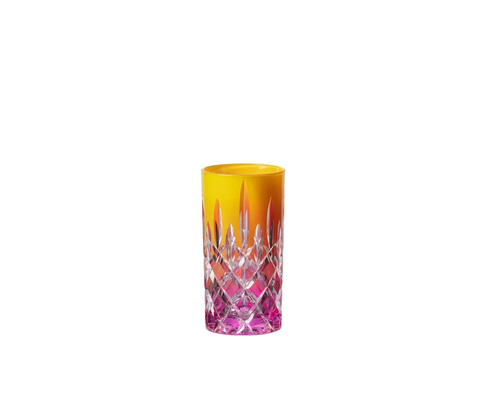This glass is ideal for mixed cocktails, with its tall shape maintaining effervescence, and is specially sized for large format ice.The tumbler revives the classic design while remaining modern with its distinctive blend of orange and pink.Presented in stunning colors like precious gems, the RIEDEL Laudon Tumblers are truly eye-catching. The luxurious cut-crystal design reflects light to allow the tumblers to sparkle. Perfect for whisky, water, cocktails or mixed drinks, these glasses will add style to any table setting and can be purchased individually for a truly unique look.This product is machine-made.Embellished products are not dishwasher safe. The embellished item could be damaged by harsh detergents in the machine. Please only wash these items by hand with a soft cloth. This way, you will enjoy the stylish shine of your favorite products for many years.This pack contains a single piece.RIEDEL Laudon Highball – orange/pink
