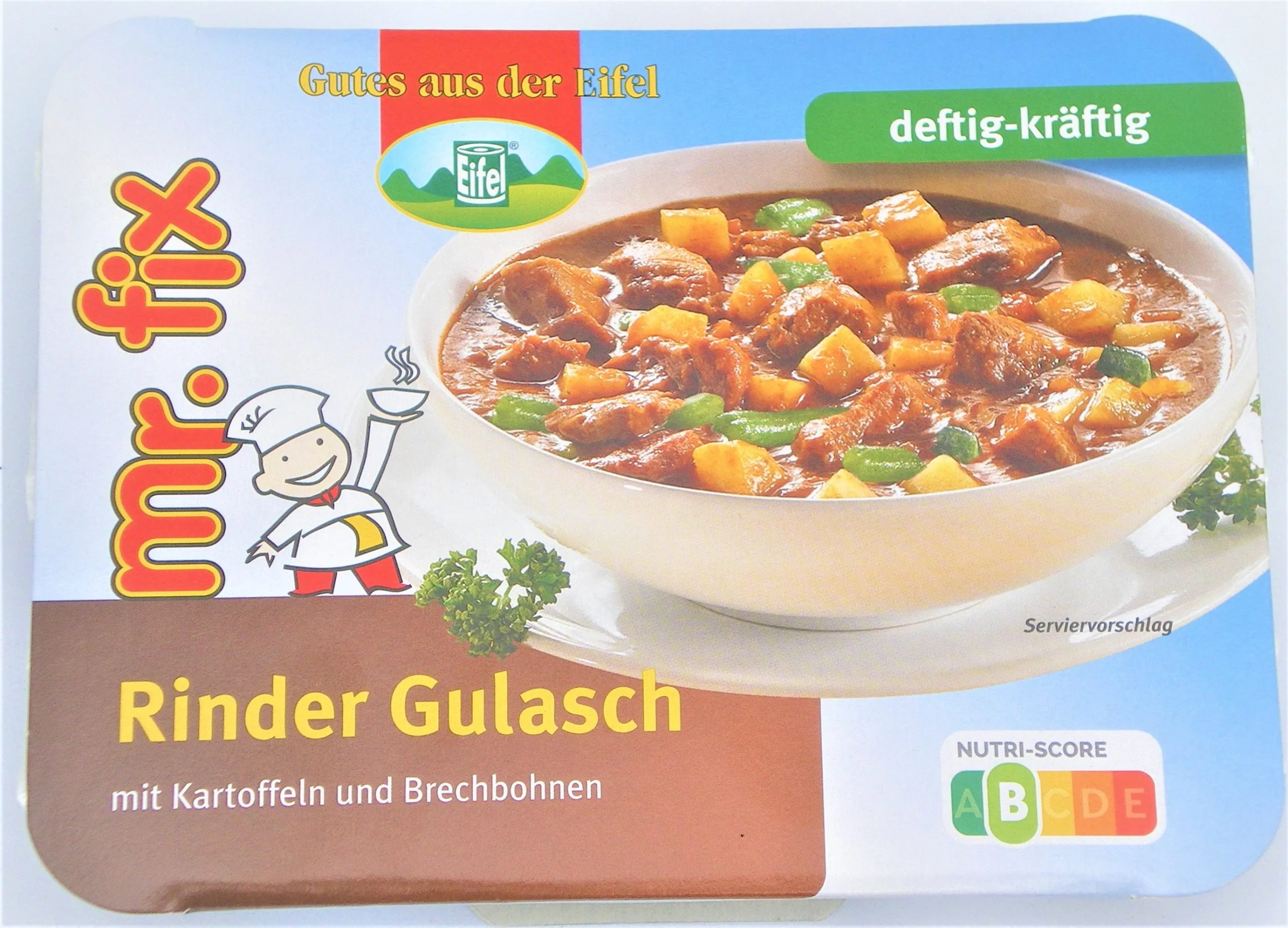Rindfleisch (26%), Trinkwasser, Kartoffeln (22%), (enthält SULFITE), Brechbohnen (16%), frische Zwiebeln, Tomatenmark 2-fach konzentriert, Rapsöl, modifizierte Stärke, jodiertes Speisesalz (Speisesalz, Kaliumjodat), Dextrose, Gewürze, WEIZENMEHL, Karamellzucker, Verdickungsmittel: Guarkernmehl, Säuerungsmittel: Citronensäure