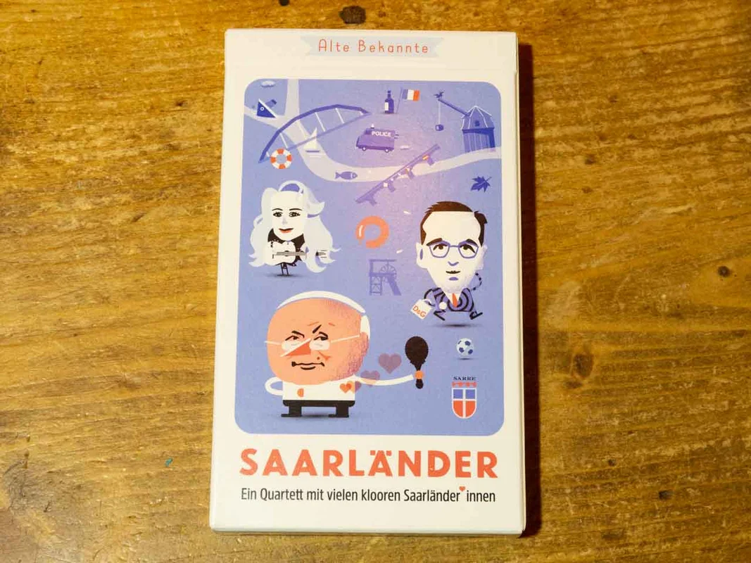 32 „kloore“ Saarländer*innenDas kleine Saarland hat viele bekannte Gesichter hervorgebracht: Ob Oskar Lafontaine, Heiko Maas, Peter Altmaier, Nicole, Heinz Becker, Erich Honecker, Thomas Bruch oder Frank Farian…. um nur ein paar zu nennen. Und diese kannst du nun gegeneinander ausspielen 🙂 32 Saarländer (geboren oder zugezogen) treten in Kategorien wie z.B. Entfernung des Geburtsorts zur Saarschleife oder Ausgeprägtheit der Ch-Sch-Schwäche zum Wettkampf an. Jede der 32 Spielkarten hat eine kurze Vita und Erläuterung der Qualifikation als „Saarländer“, versehen mit tollen Illustrationen des Saarbrücker Illustratoren Stefan (besser bekannt als Ede) Grenner, der unter anderem auch die Etiketten für verschiedene Saarbrücker Bruch Biere entworfen hat.Dieses Kartenspiel ist ein MUSS für jeden Saarländer!