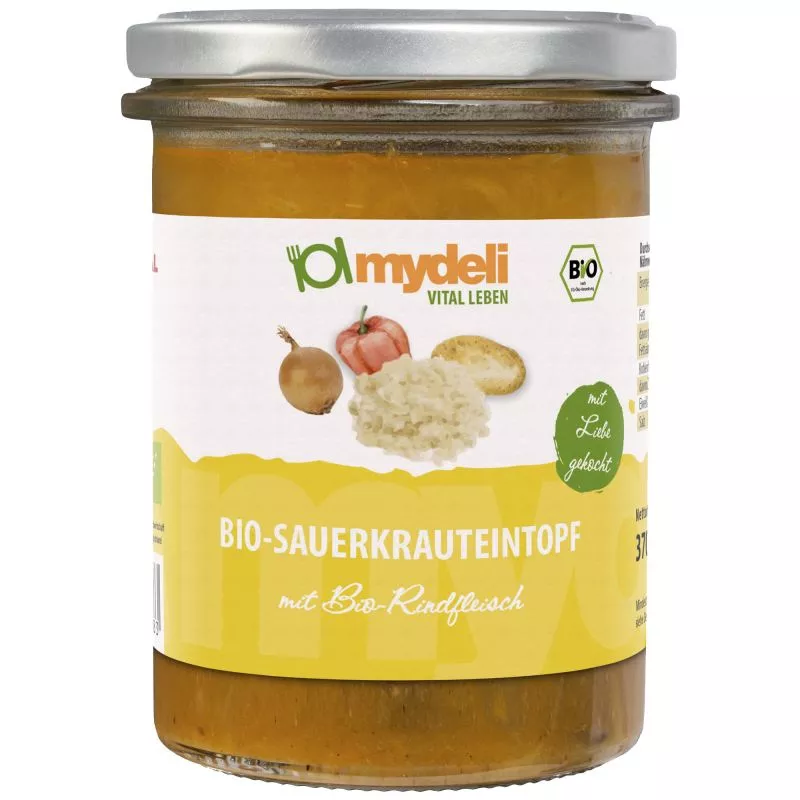 Zutaten: Trinkwasser; Rindfleisch* 19%; Sauerkraut* 14% (Weißkohl*, Salz), Kartoffeln* 10%, Kidneybohnen* Rapsöl*, Zucker*, Speisesalz, Zwiebeln* 0,9%, Maisstärke*, Paprika geräuchert* 0,2%, Karotten*, Sonnenblumenöl*, Dextrose*, Verdickungsmittel: Guarkernmehl*, Gewürze*, Kräuter*