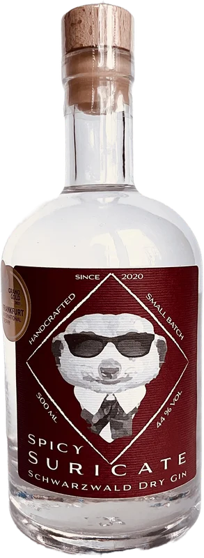 More information about Spicy Suricate Black Forest Dry Gin Spicy Suricate Schwarzwald Dry Gin is a gin made by hand with a lot of love.A composition of different citrus notes from coriander seeds, Earl Grey tea and lemons play perfectly together with pomegranate, licorice root and elderberry. Ginger, mint and black pepper provide the drive.The batches are named after cities that have played a role in the course of our friendship.At both the Frankfurt International Trophy 2021 and the Europe Wine & Spirits Trophy 2022, Spicy Suricate Schwarzwald Dry Gin won the respective top awards in the form of Grand Gold and Double Gold.Something special for all those who are looking for a high-quality gin with a Mediterranean taste away from the mass market.