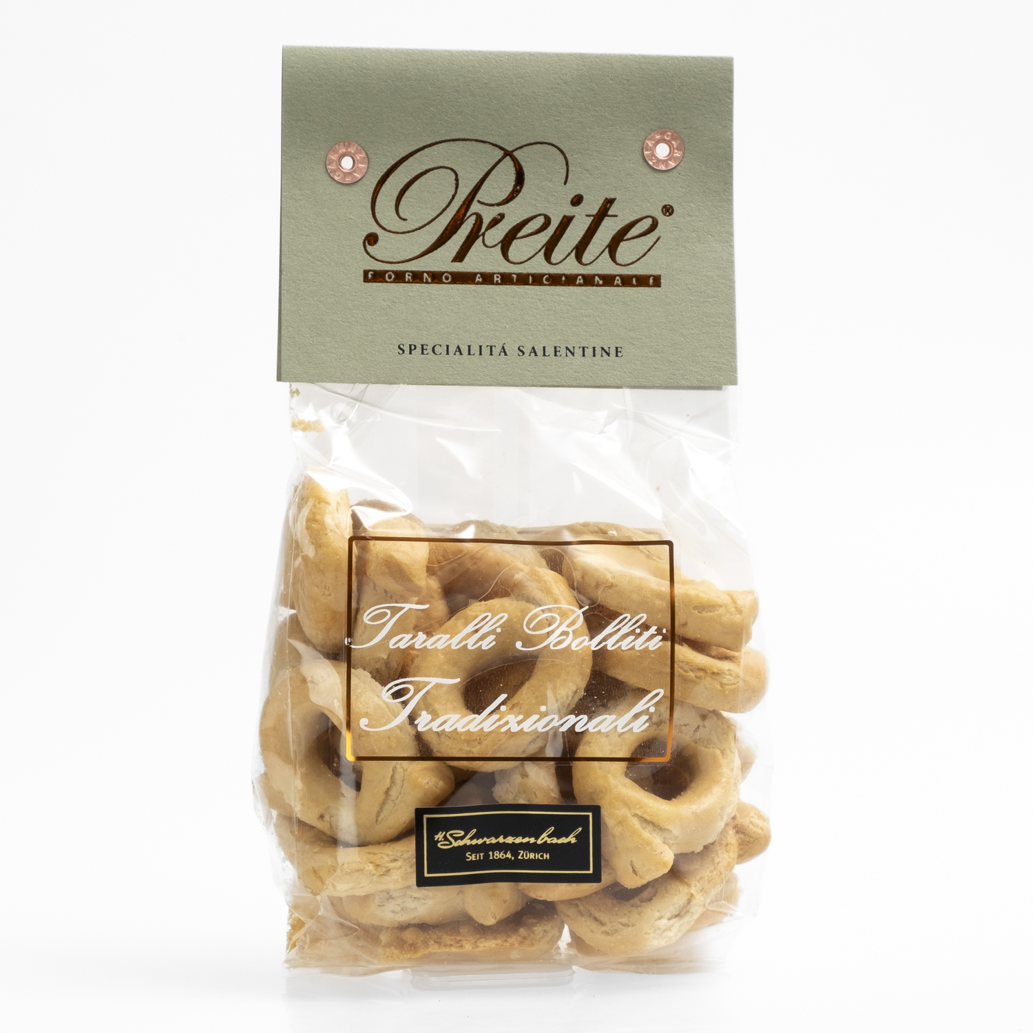 The traditional Italian snacks from Puglia are savoury bread sticks rolled into rings that are first boiled and then baked. The handmade Taralli have a golden-yellow surface and a crispy and crumbly texture. They are excellent as an aperitif with a good glass of wine or as a bread substitute with a platter of cold cuts or cheese.