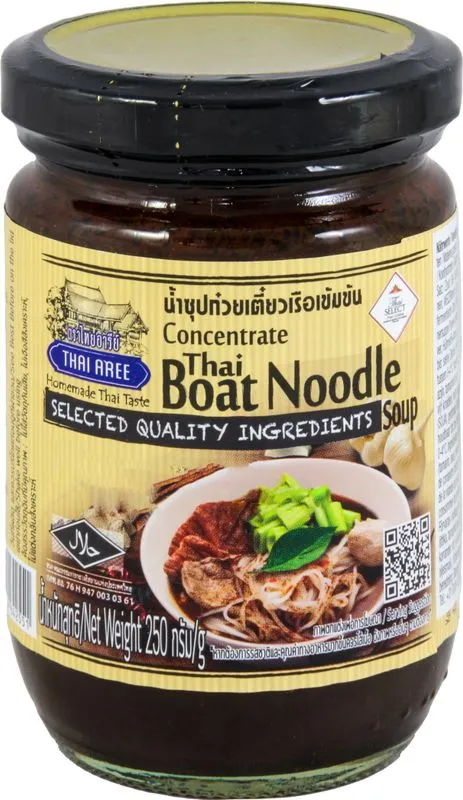 Thai Aree – Thai Boat Nudelsuppen Konzentrat 240gWürzpaste für Reisnudelsuppe Zutaten: SOJAsauce (SOJAbohnen, WEIZENmehl, Sole, Zucker), Zucker, Kokosnussmilch, Glukosesirup, fermentierter Knoblauch (Knoblauch, Salz), Branntweinessig, Tamarindenpaste (Tamarinde, Wasser), fermentiertes Chili (Chili, Salz, Konservierungsstoff: E260), Gewürzmischung (Zimt, Sternanis, Galgant, Koriandersamen, weißer Pfeffer, fünf-Gewürz-Pulver), Korianderwurzel, Hühnersuppenpulver (raffiniertes jodiertes Steinsalz, Puderzucker, Geschmacksverstärker: E635, hydrolisiertes pflanzliches Eiweiß (SOJAbohnen), getrocknetes Hühnerfleisch-Pulver, Hühneröl-Aroma), Verdickungsmittel: E1442, Geschmacksverstärker: E635, raffiniertes Steinsalz, rote Bohnen Paste, Stabilisator: E415, Hefeextrakt. Allergene: Soja, Weizen. Nach dem Öffnen bei 0-4°C im Kühlschrank lagern. Vor Verwendung schütteln. Inhalt: 250g Mindestens Haltbar bis: 01. 10. 2026 Herkunft: Thailand Hergestellt von:CPF FOOD AND BEVERAGE Co. Ltd, Thailand Importeur: ASIA EXPRESS FOOD, Kilbystraat 1, 8263 CJ Kampen (NL) Versandgewicht: 540g Durchschnittliche Nährwertangaben pro 100g Average Nutritional Values per 100g Brennwert / Energy 1063 kJ / 253 kcal Fett / Fat 2,0g davon gesättigte Fettsäuren / of which saturates 2,0g Kohlenhydrate / Carbohydrates 67g davon Zucker / of which sugar 18g Eiweiß / Protein 5,0g Salz / Salt 9,0g