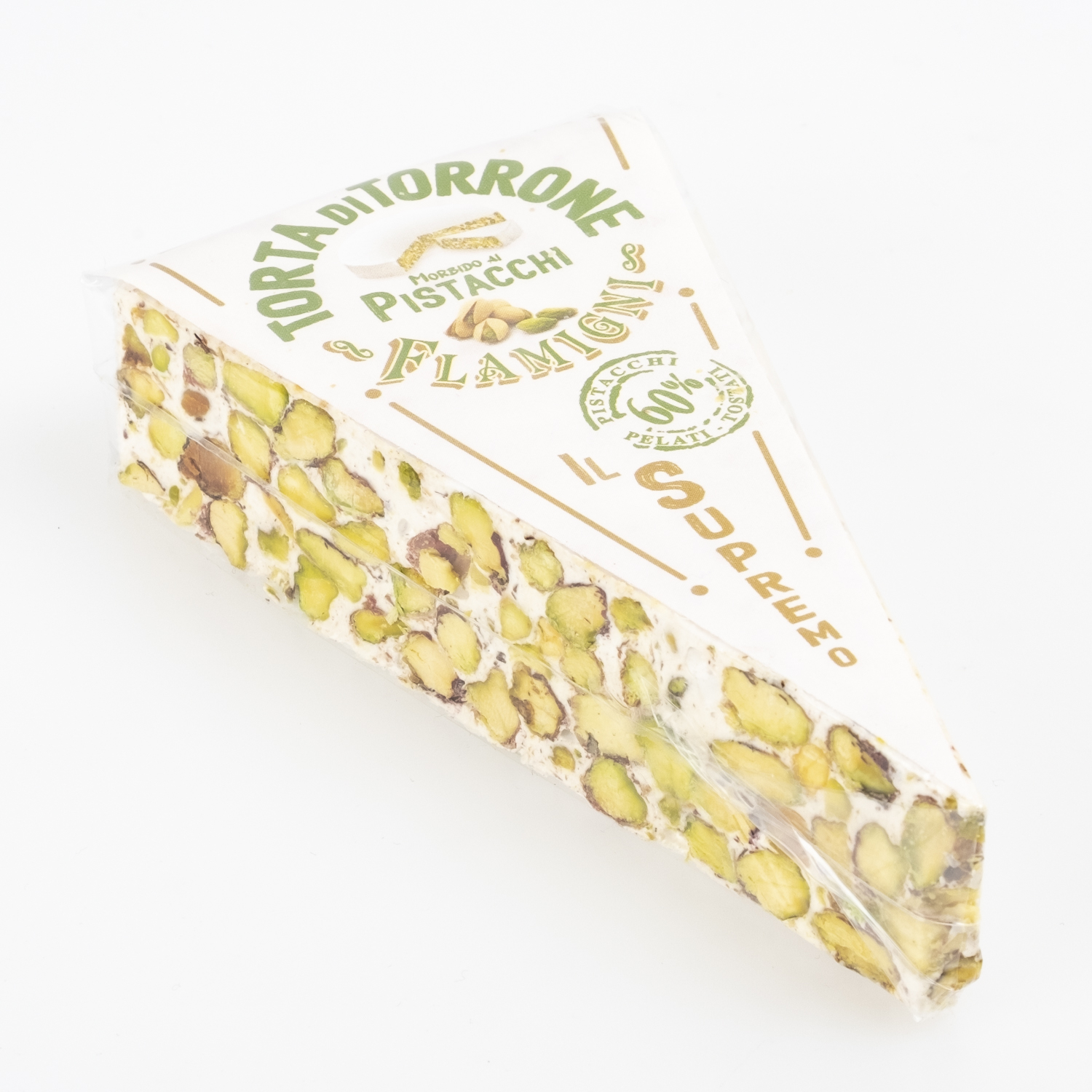 The soft “Torta di Torrone” nougat with fine pistachios from Sicily and Persia is handmade by the well-known Flamigni manufactory in Emilia Romagna according to a traditional recipe with high-quality ingredients.